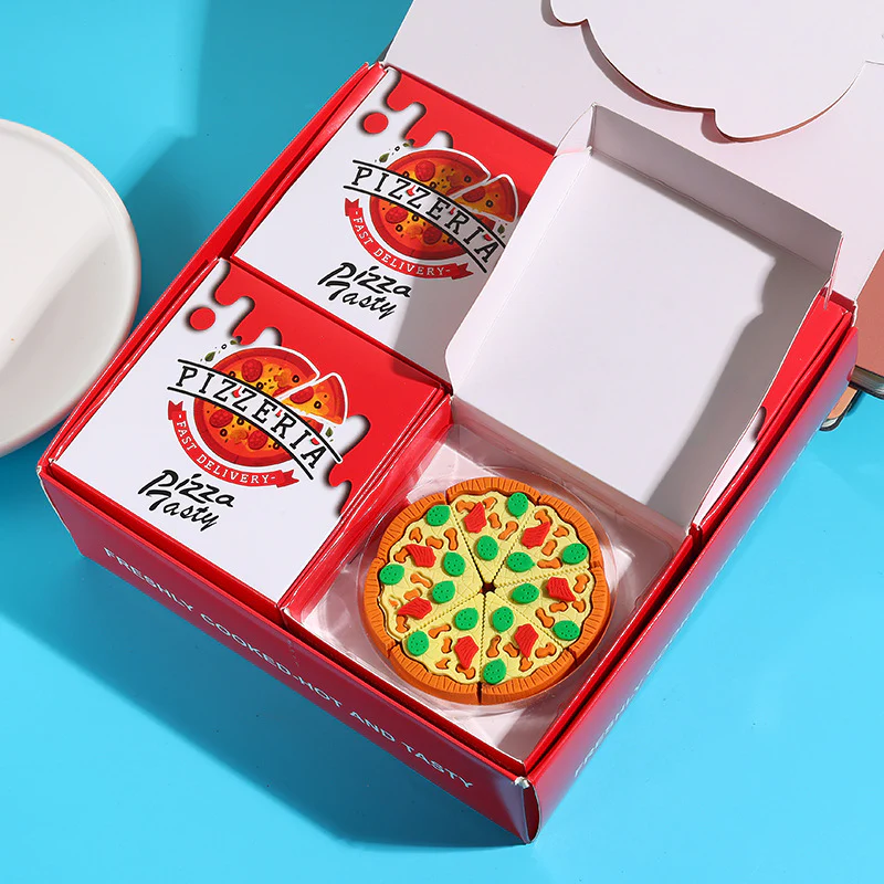(Goma para borrar con diseño en forma de pizza. Cada una de las gomas en forma de pizza simula estar cortada en porciones y vienen en cajitas individuales. Disponibles 12 unidades).