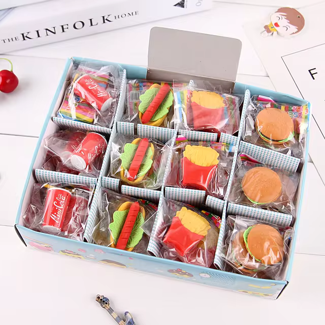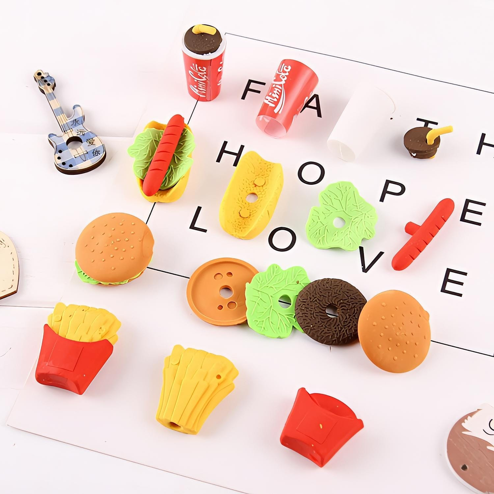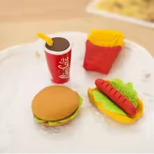 (Goma de borrar en forma de hamburguesas, panchos, papas fritas y gaseosa. Viene en caja x 48 unidades).