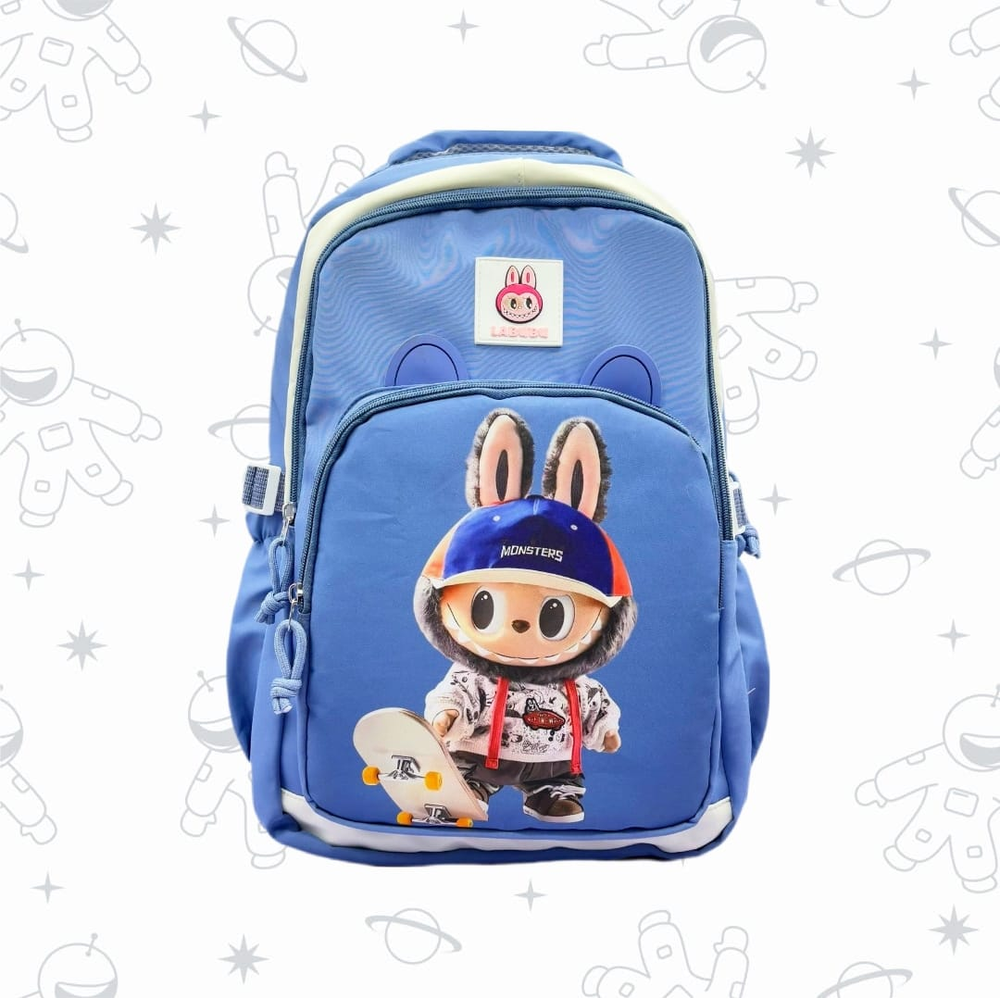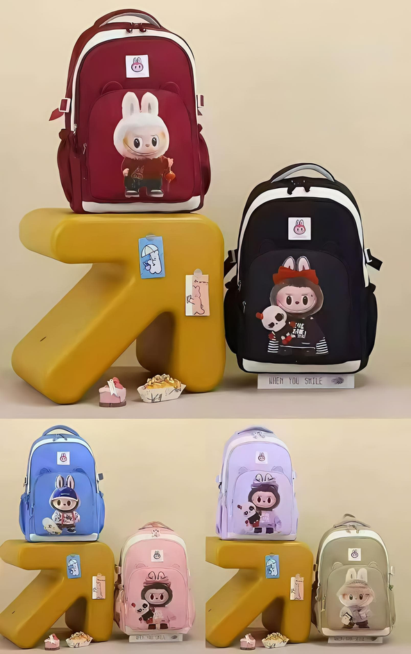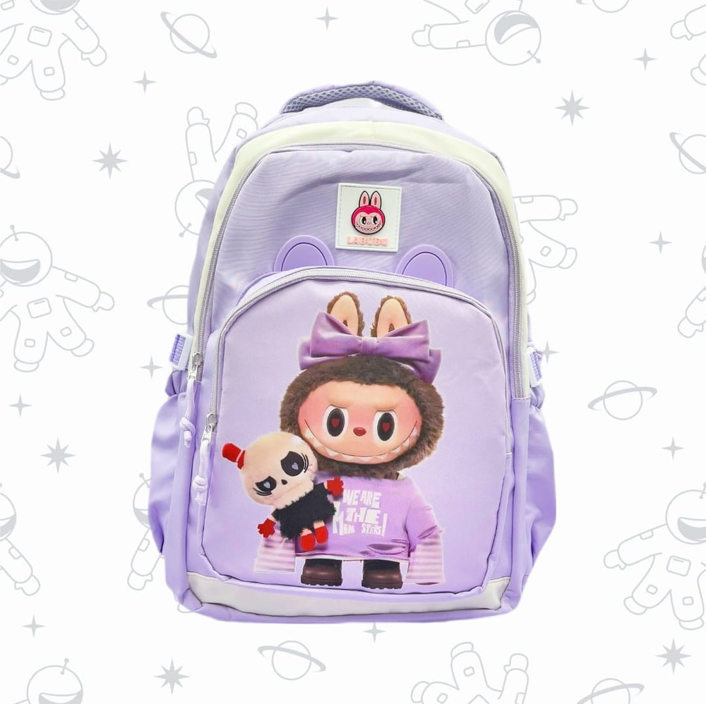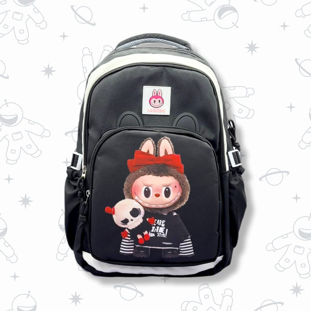 (Mochila escolar disponible en 4 colores con motivo de los personajes "Labubu". Haz que las niñas y niños disfruten de ir al colegio con todas sus cosas organizadas y con sus diseños preferidos. Cuenta con tiras acolchonadas, un compartimiento principal con bolsillo interno, 2 compartimientos frontales, 2 compartimientos laterales y un bolsillo trasero con cierre).