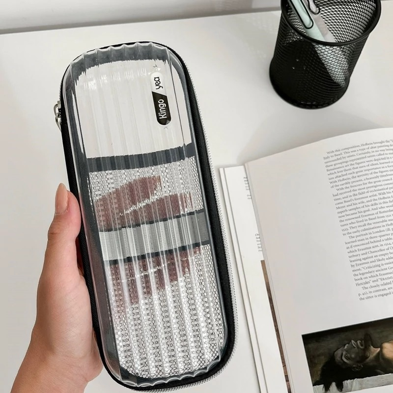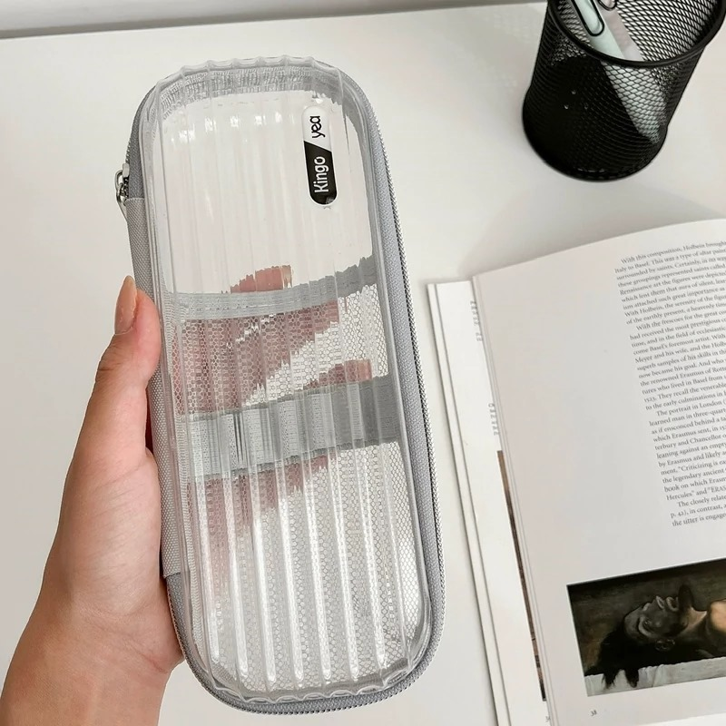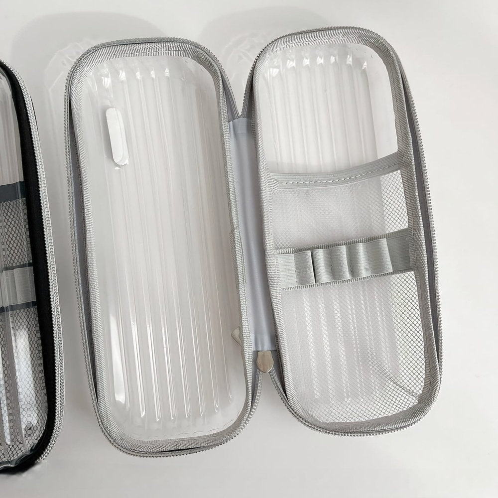 (Cartuchera ideal para guardar y organizar lapiceras, lápices, gomas de borrar, sacapuntas, tijeras, pegamento y otros pequeños accesorios. Vienen en 3 colores: negro, azul y gris. Cuentan con un bolsillo red y un separador para colocar útiles).
