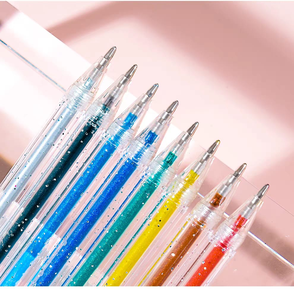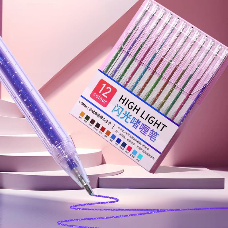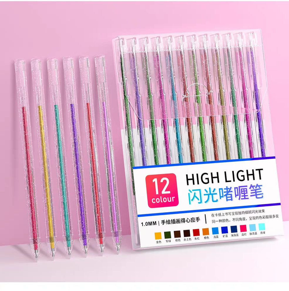 (Cada set trae 12 biromes de gel + glitter de distintos colores. Su punta es de 1,0mm. Agrega diferentes colores a tus dibujos, anotaciones y bocetos).