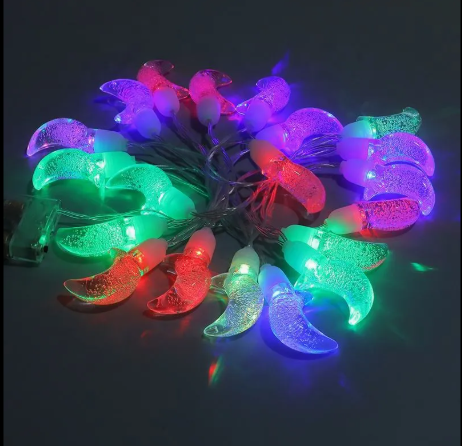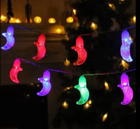 (Luz guirnalda tipo enchufe. Cuenta con 10 luces multicolor con diseño luna. Y cuentan con 2 cabezales un cable de enchufe y otra de extención. Ideal para decorar tu hogar, oficina, comercio, etc).