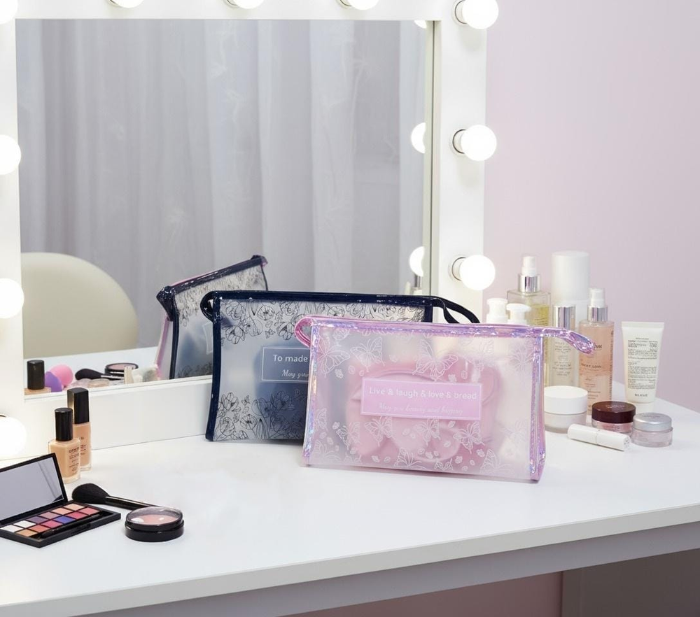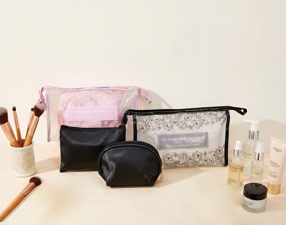 (Set de 3 portacosméticos que sirven para guardar y organizar productos de belleza, maquillaje, artículos de tocador y accesorios personales, manteniéndolos ordenados y protegidos. Su diseño permite transportarlos fácilmente, siendo ideales para viajes, escapadas o simplemente para mover los productos dentro del hogar, como del baño al tocador. Ayudan a mantener los cosméticos limpios y protegidos del polvo y la humedad, especialmente si se usan en el baño).
