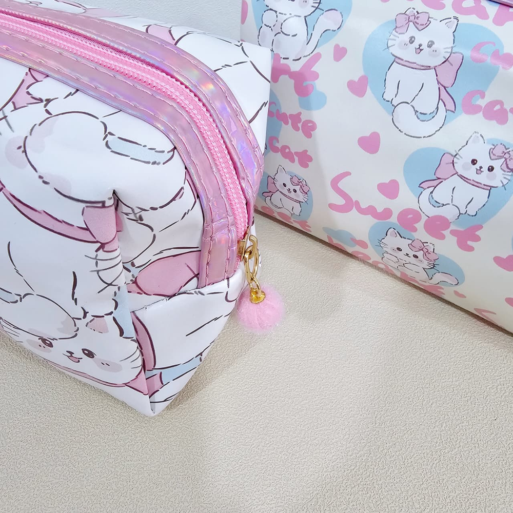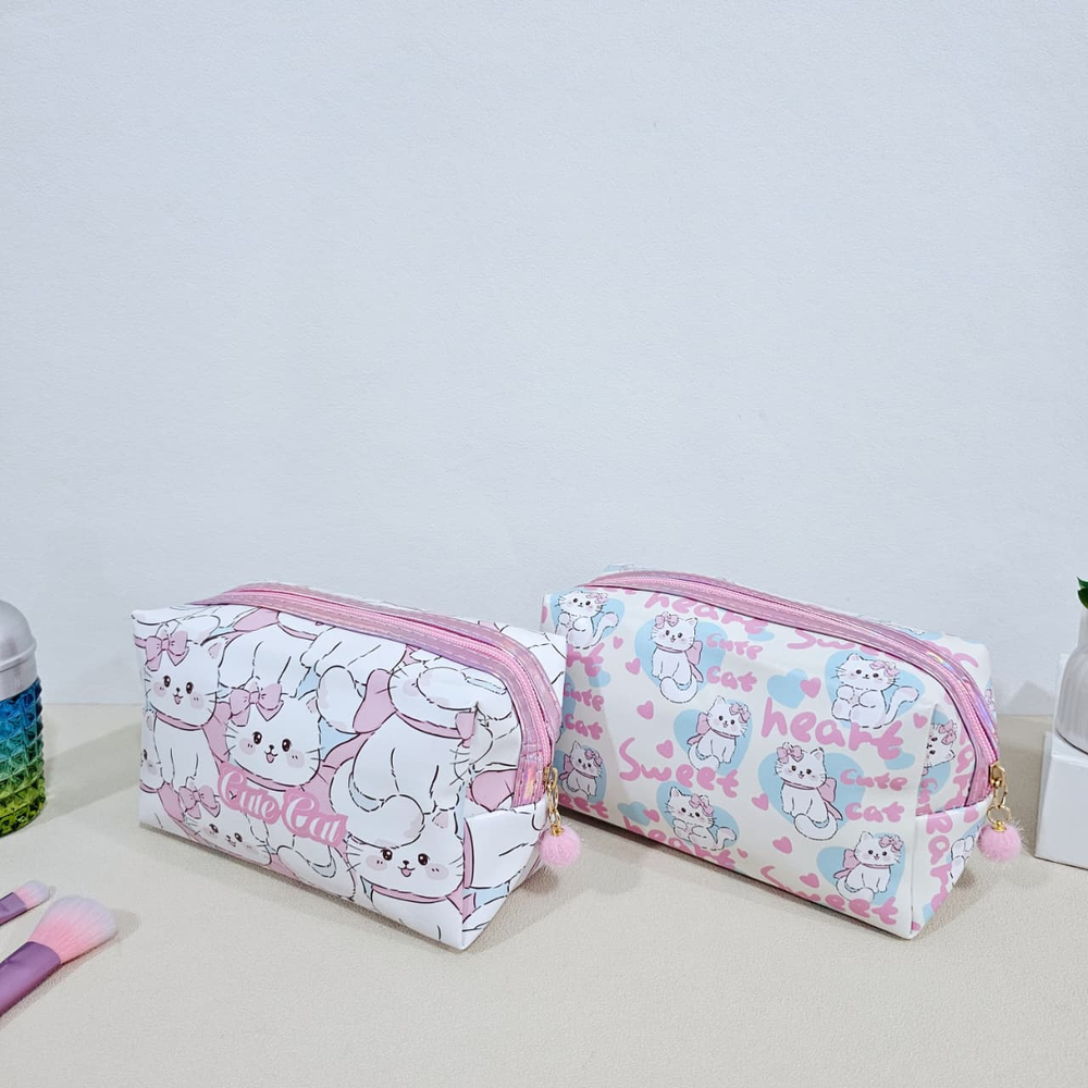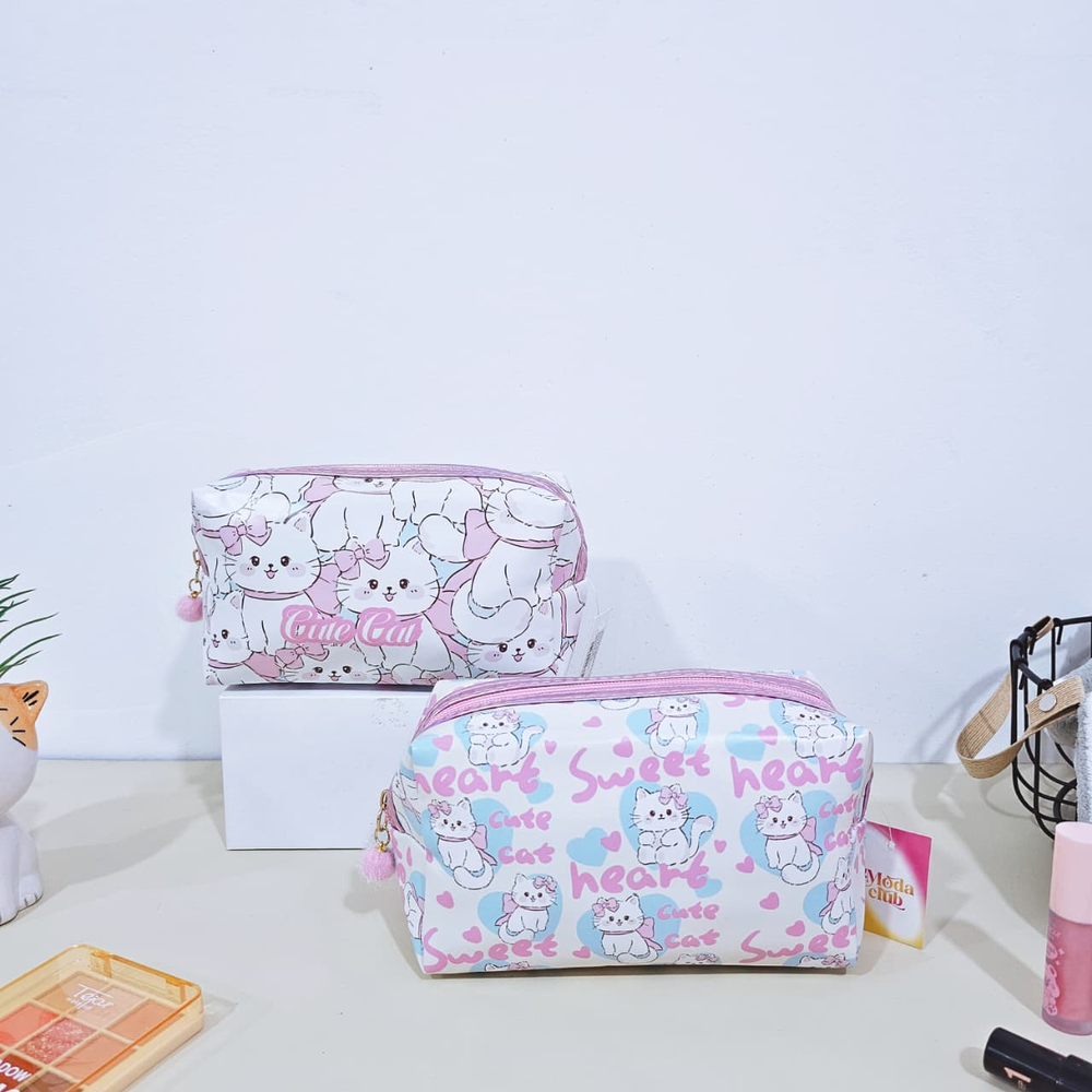 (Neceser que permite guardar y organizar de manera eficiente productos de maquillaje, como labiales, brochas, paletas de sombras, cremas y otros artículos personales. Facilita el transporte de cosméticos de forma segura, evitando pérdidas o daños durante viajes o traslados. Mantiene los productos de belleza ordenados y fácilmente accesibles, lo que agiliza la rutina de maquillaje Son multifuncionales y pueden usarse también para guardar joyas, accesorios electrónicos o artículos de tocador. Disponibles en 2 estampas de gatitos). (Ut28)
