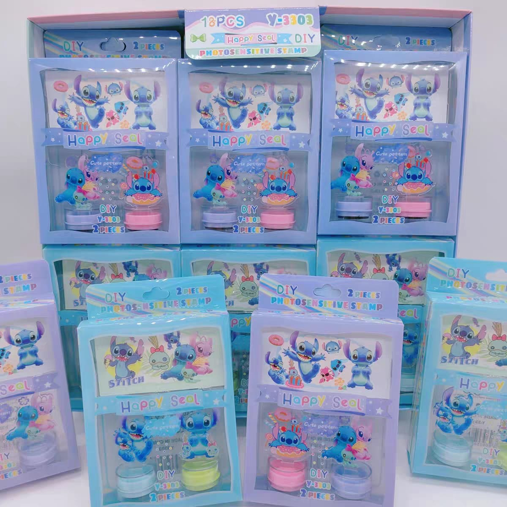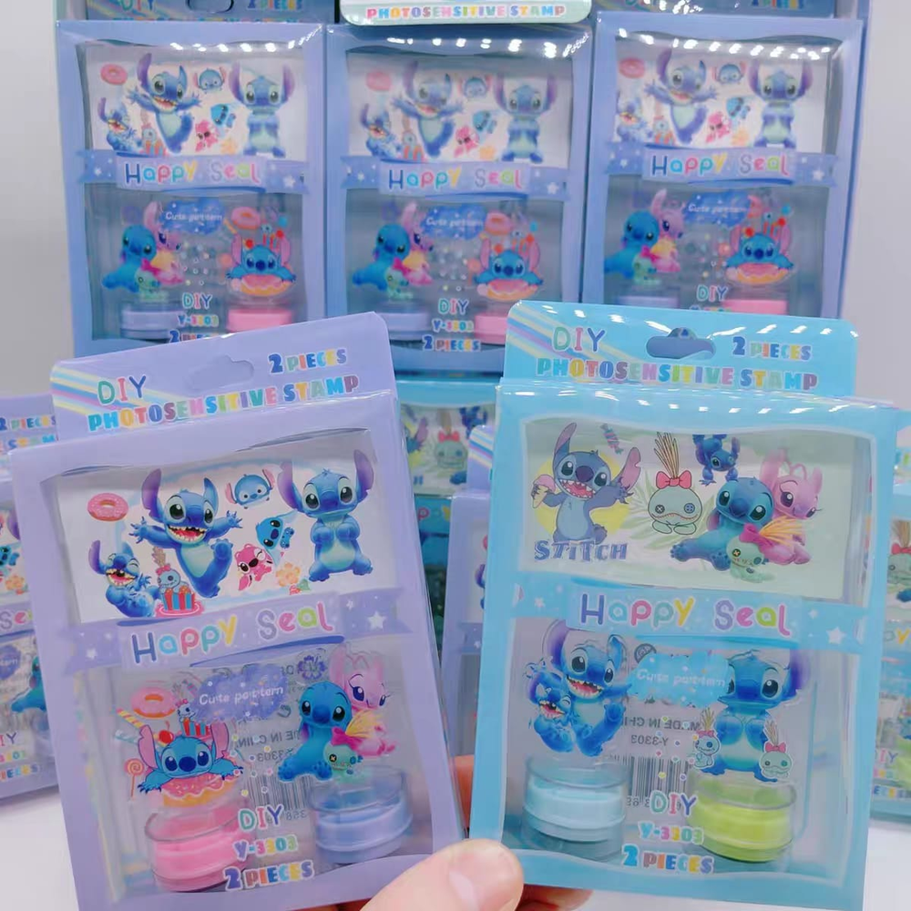 (Cada set cuenta con 2 sellos con temática de "Stitch" y también un anotador. Ideal para uso escolar, Los sellos vienen en 4 colores diferentes: rosa y violeta y el otro set verde y azul).