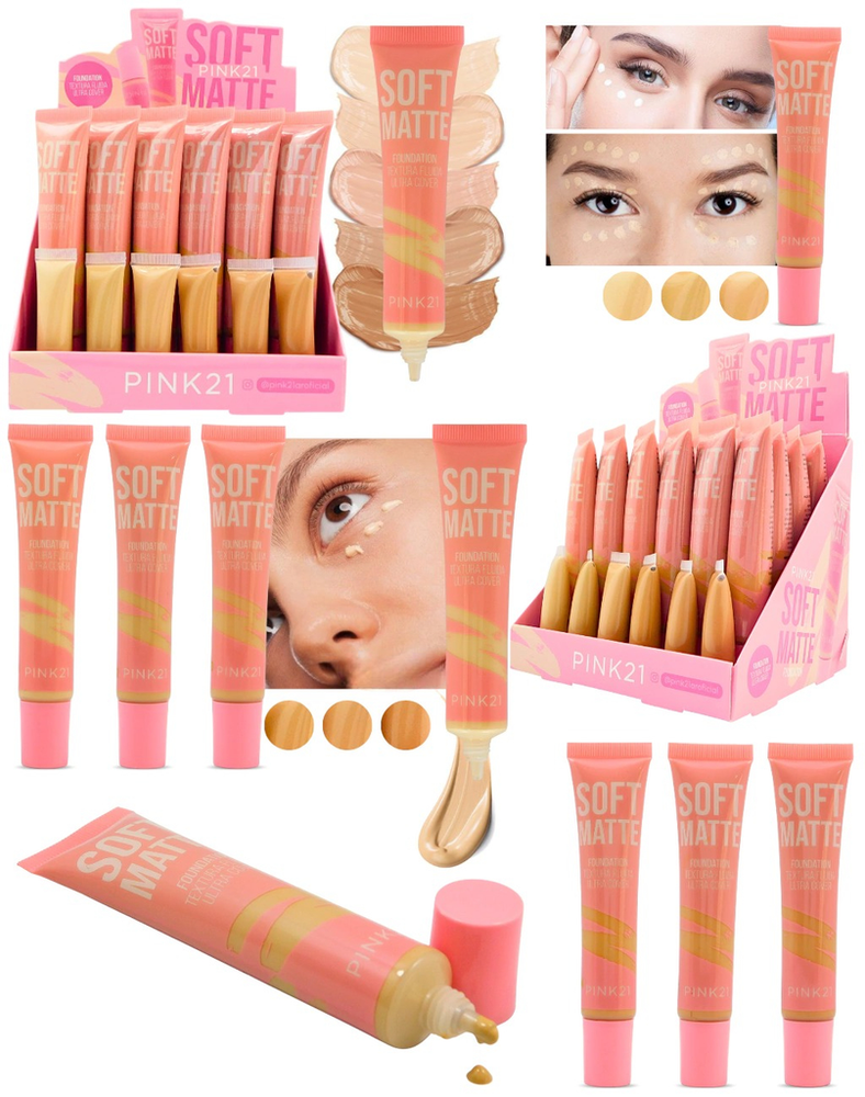 (Base de Maquillaje "Pink 21" con acabado mate suave y textura fluida que ofrece alta cobertura. 6Tonos diferentes a elección).