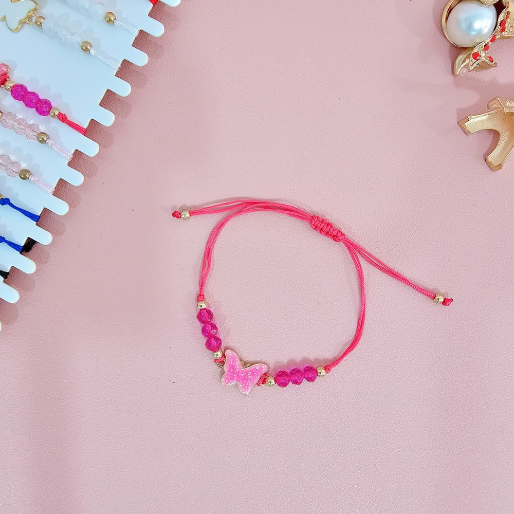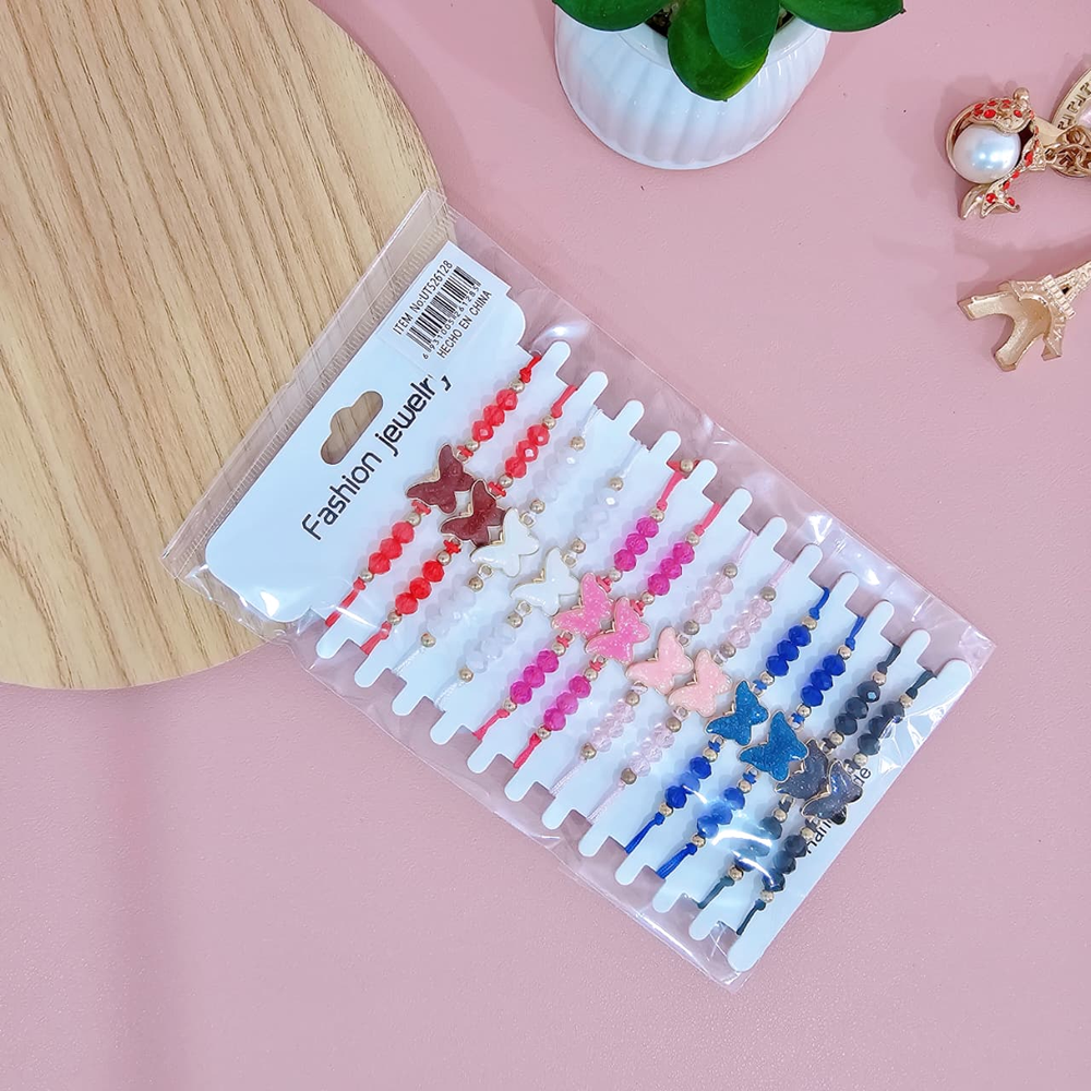 (Blíster con 12 unidades de pulseras, en colores varios con un dije de mariposa. Diseño delicado con correas ajustables.)