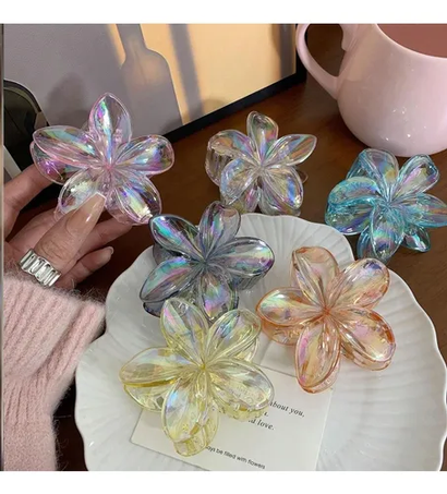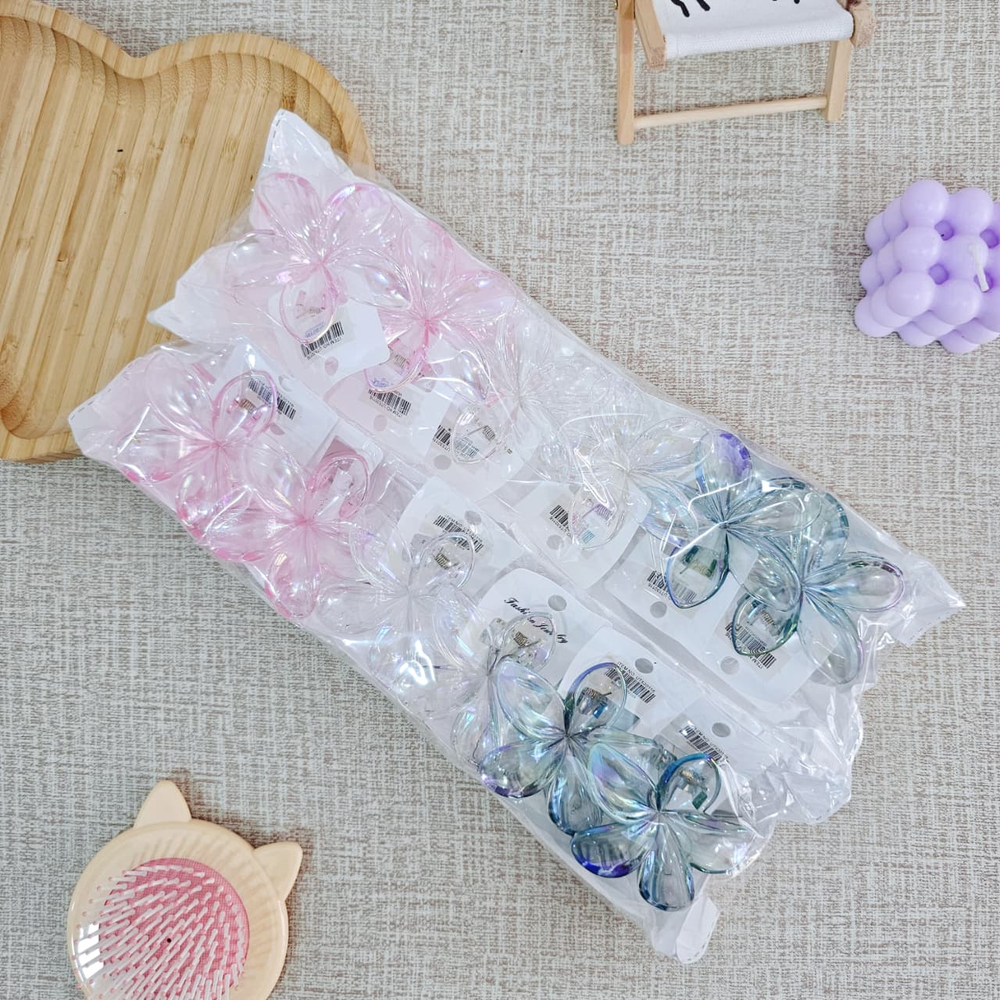 (Pack x 12 hebillas con forma de flor colores tornasolados y transparente tornasolado. Ideal para usar en cualquier evento o simplemente levantar tu look del día). (Ut.29) (Js31)