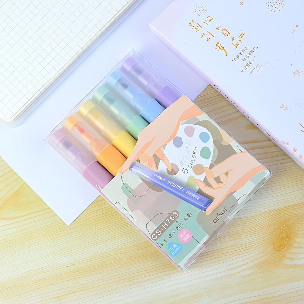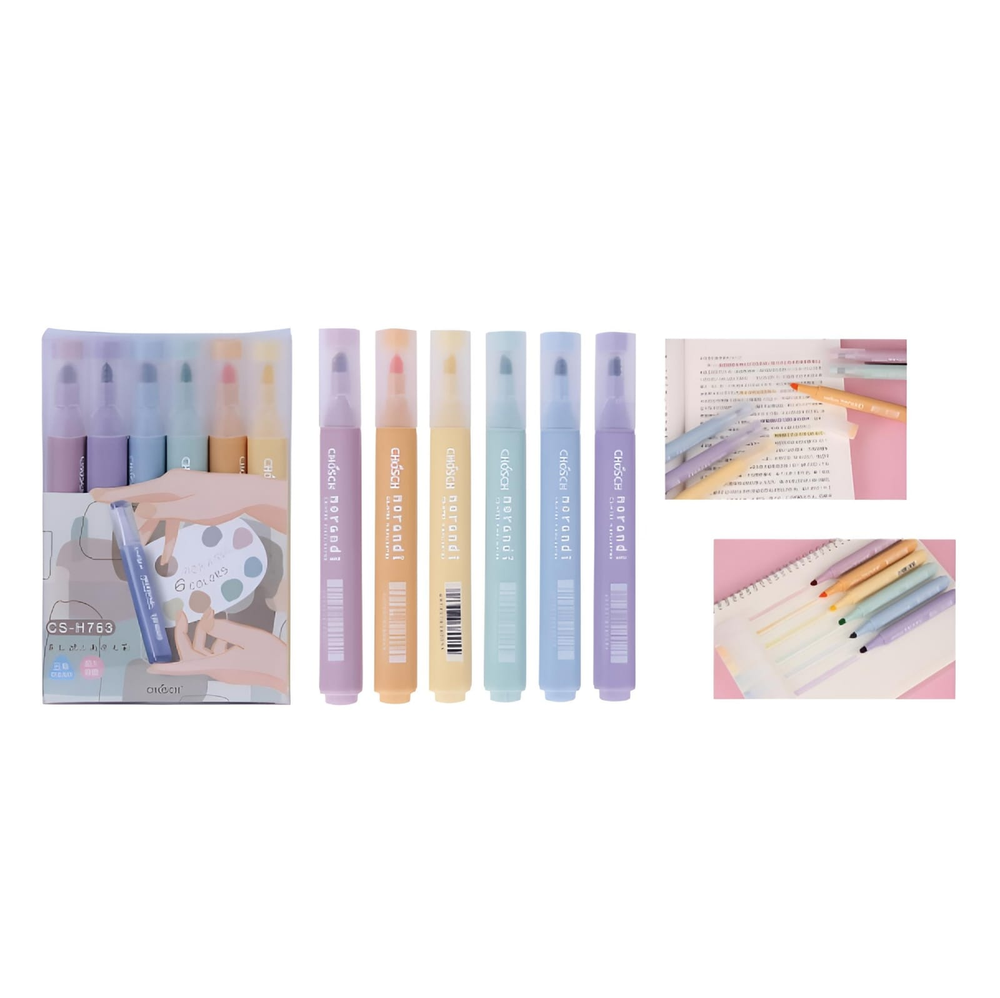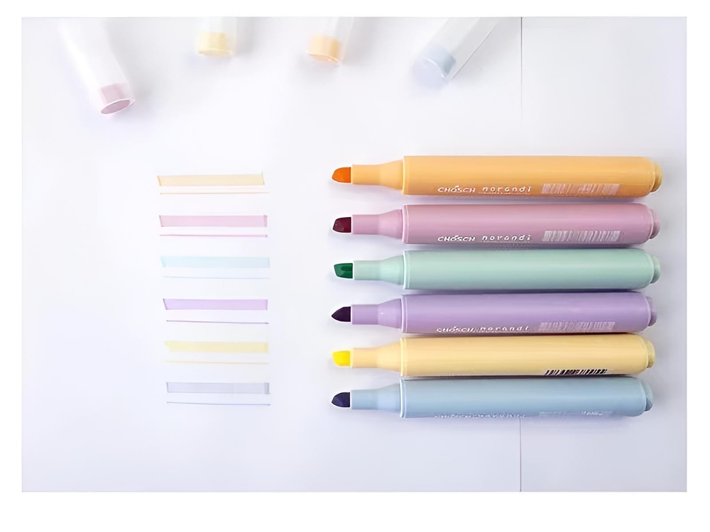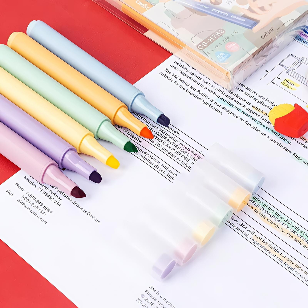 (Tienen una punta biselada que permite trazos finos y gruesos. El diseño de estos resaltadores es ergonómico, a menudo con un cuerpo triangular para un agarre más cómodo).
