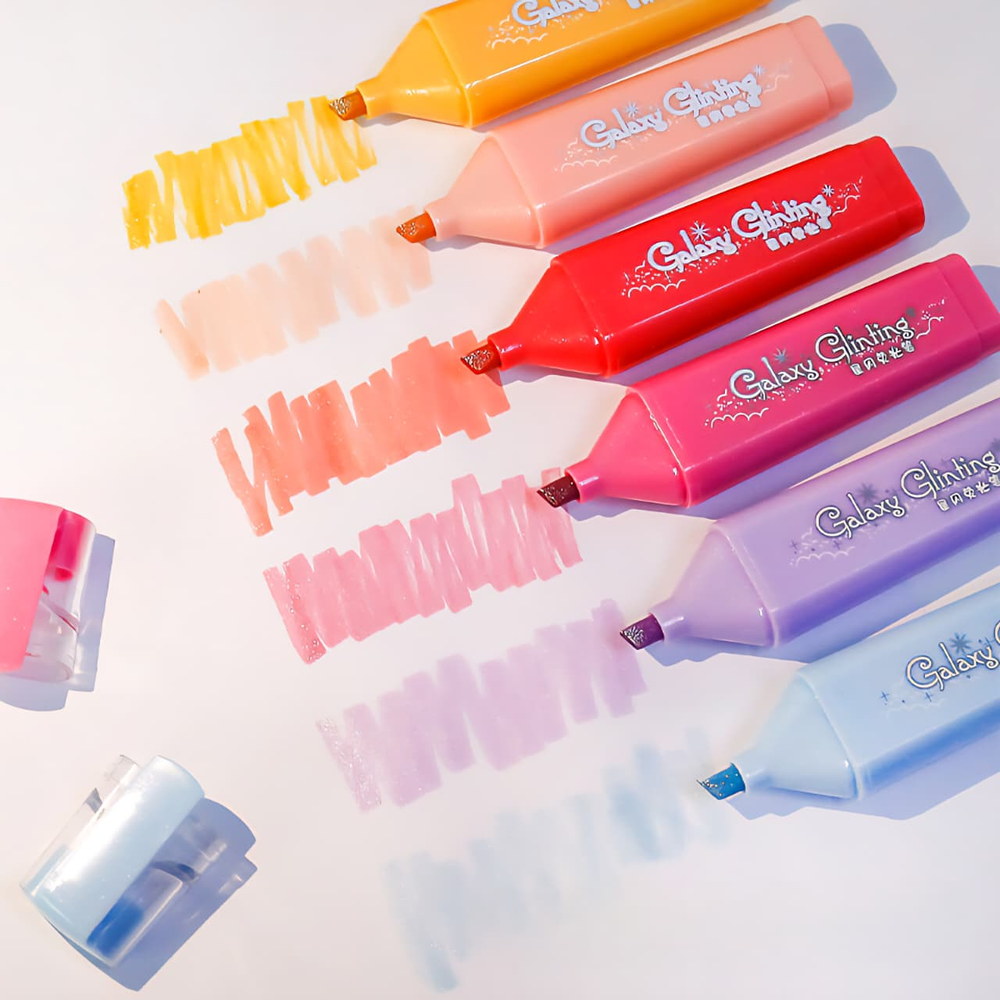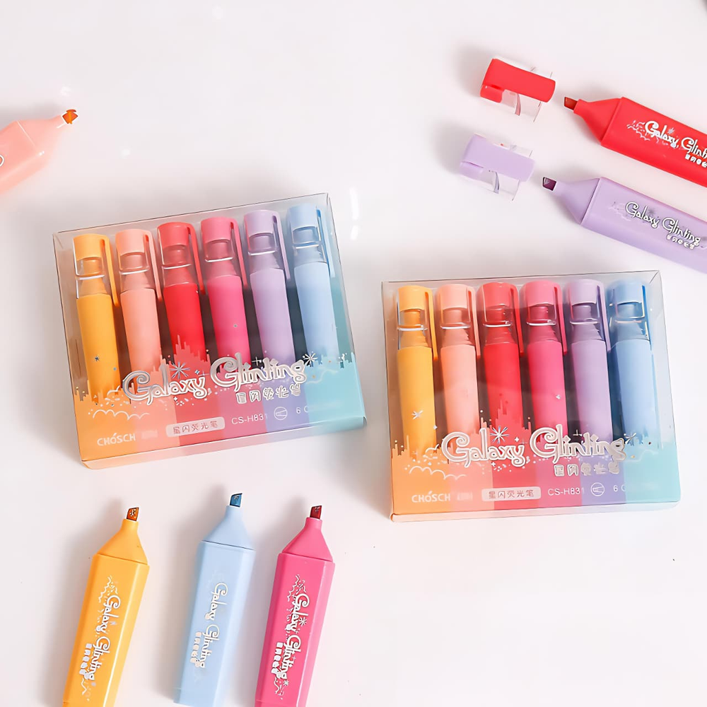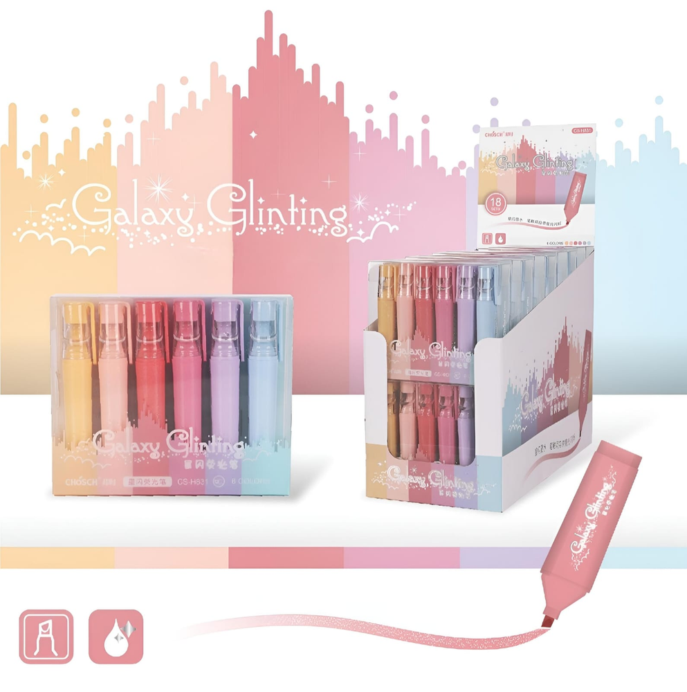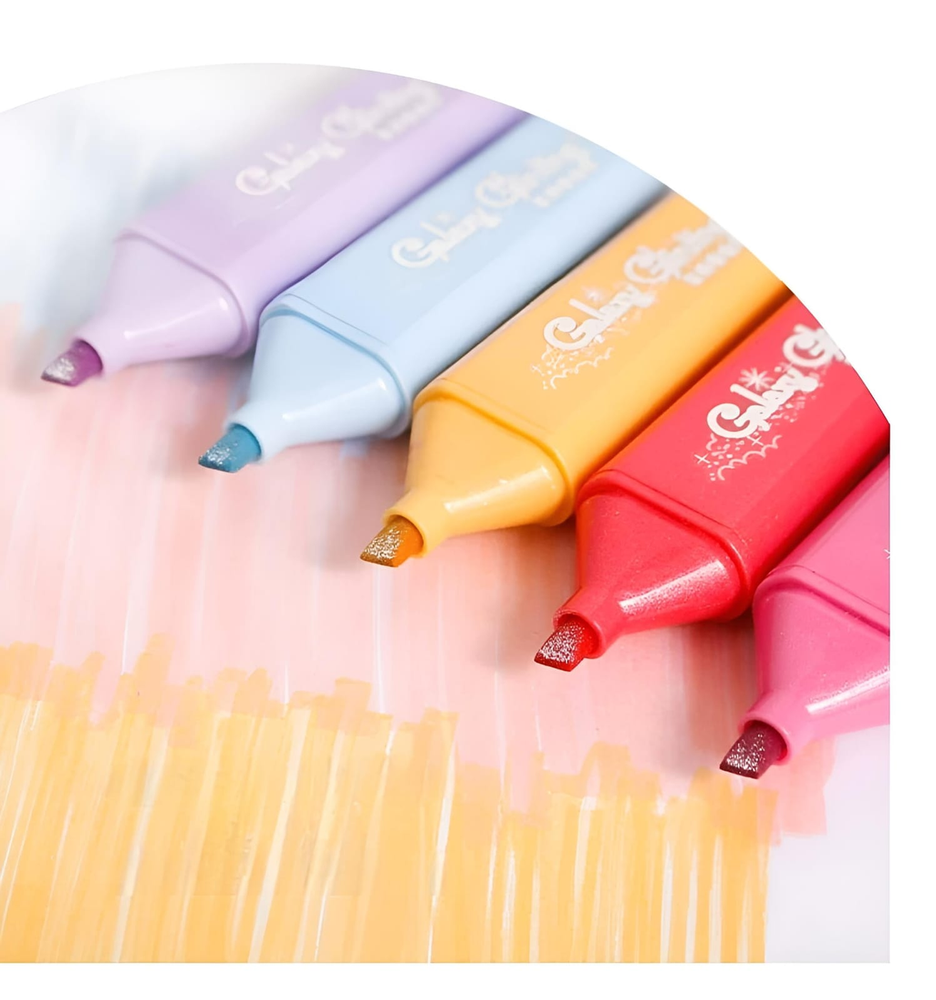 (El set incluye 6 resaltadores de tonos pastel con glitter. Tienen una punta biselada que permite crear líneas de diferentes grosores). ut30