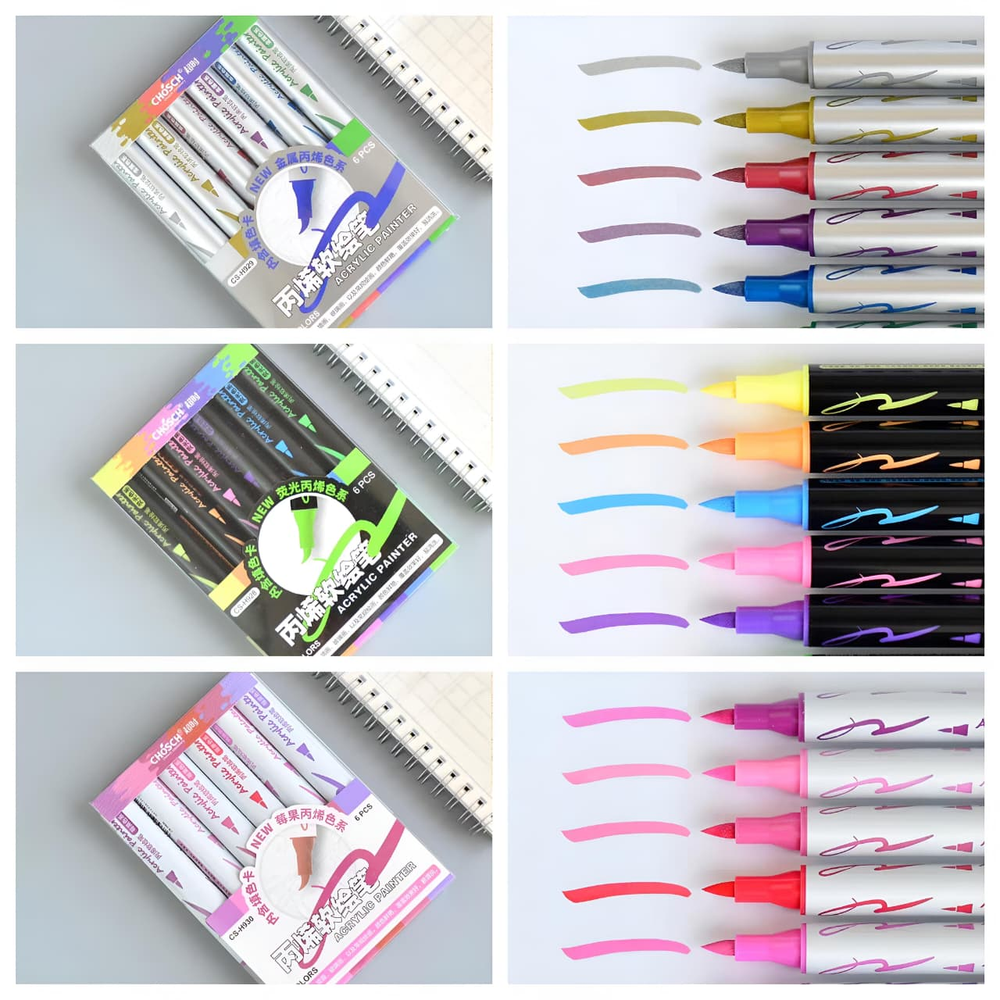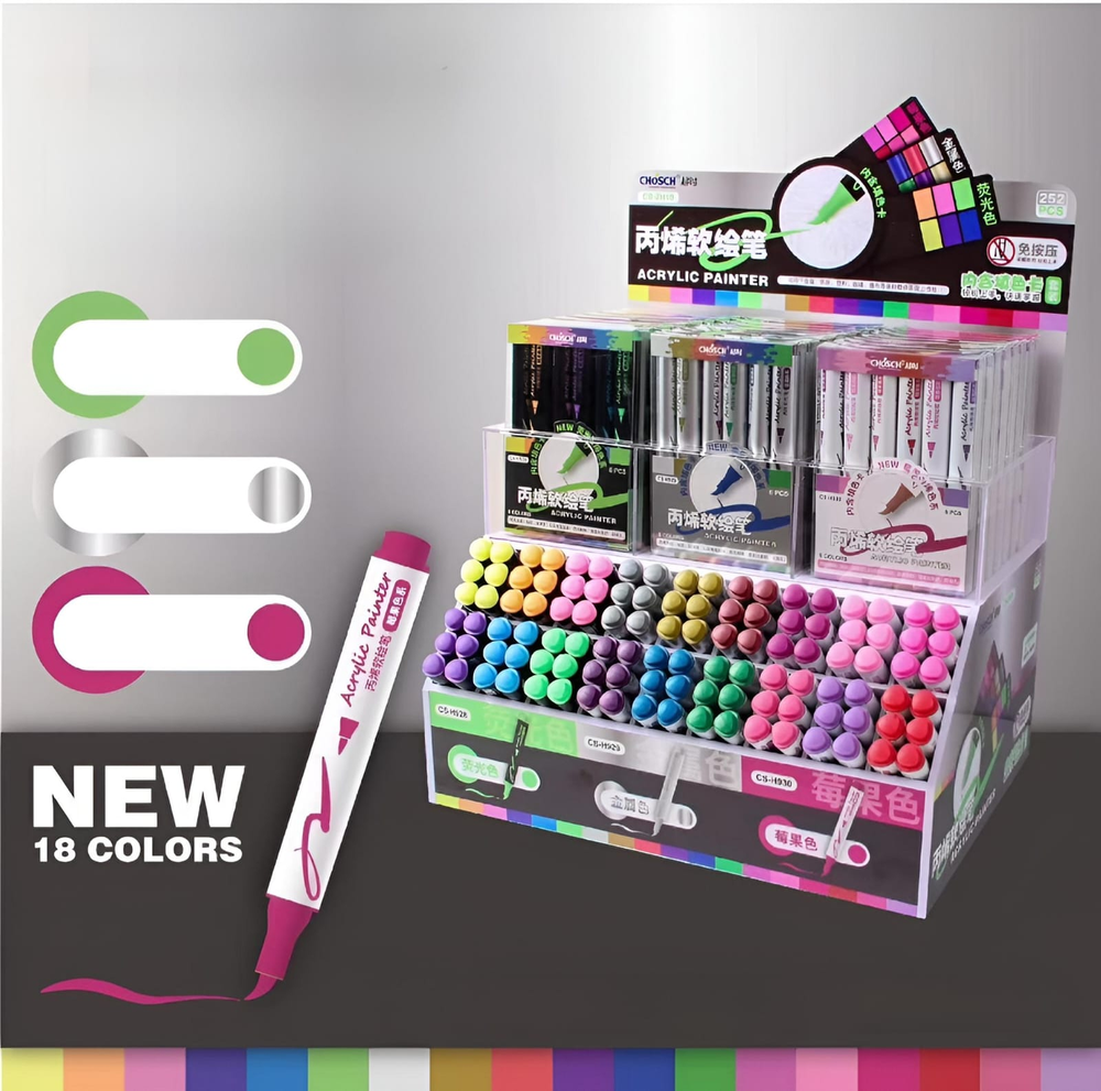(Caja x 252U. + Exhibidor Marcador marca "CHÓSCH", tinta acrílica ideal para pintar en vidrio, pared o superficie oscuras como cartulina, etc. Punta tipo pincel. Contiene 24 Set x 6 unidades en cajitas y 108 unidades sueltas, 6 de cada color).