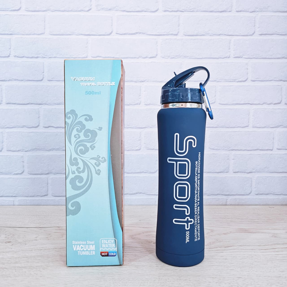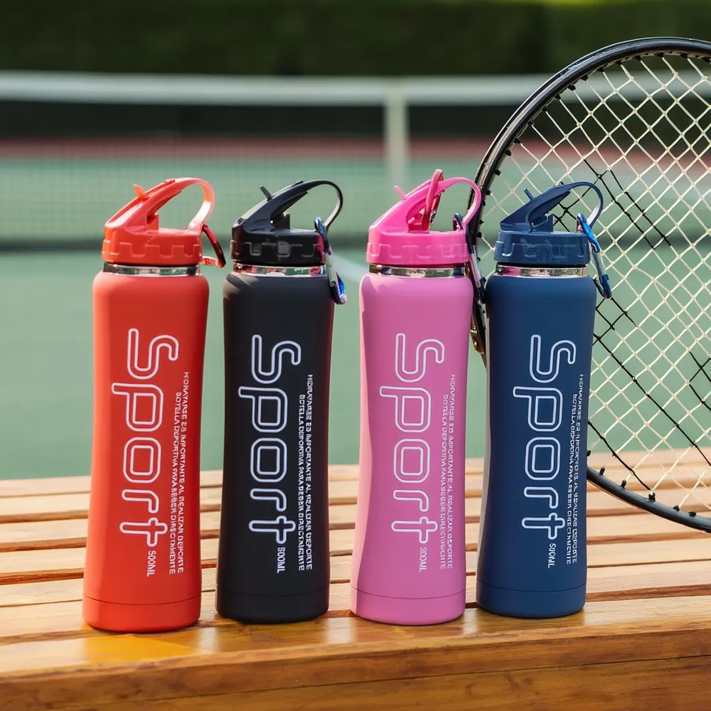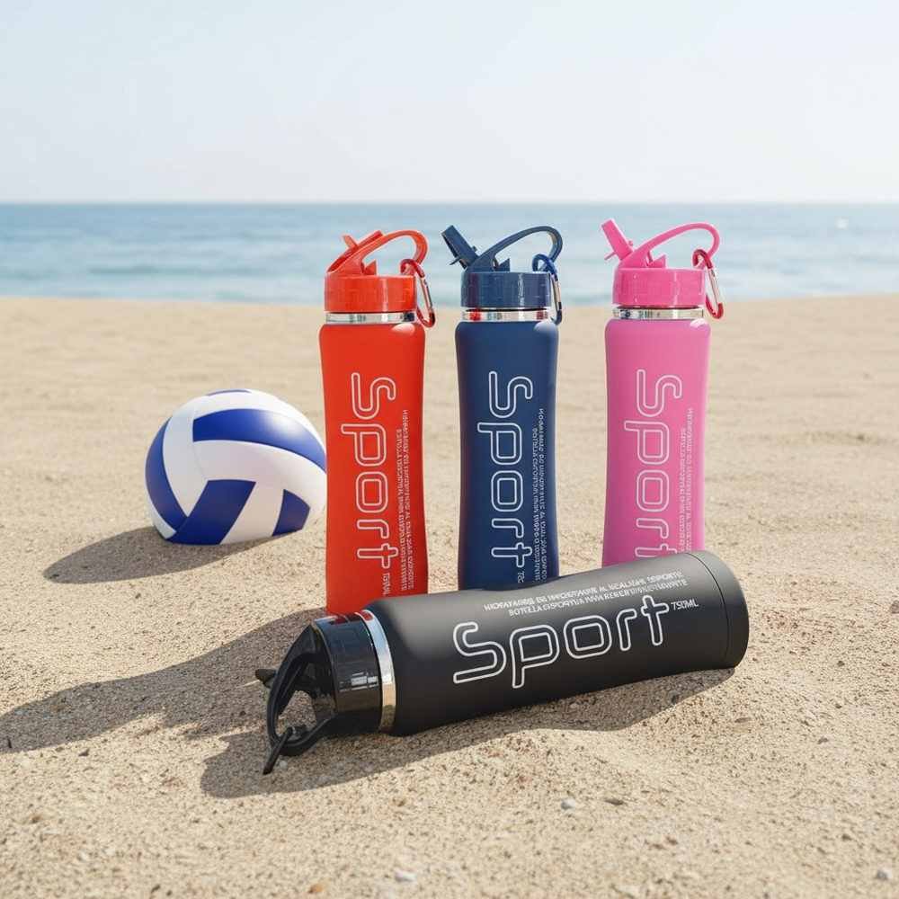 (Botella con pico rebatible y sorbete. Están fabricadas en acero inoxidable de doble capa, el exterior de la botella tiene una pintura engomada antideslizante para un mejor agarre. Cuentan con un tapón hermético que evita derrames y un gancho para colgarlas en una mochila, lo que las hace muy prácticas para llevar al gimnasio, al colegio o a cualquier otra actividad).