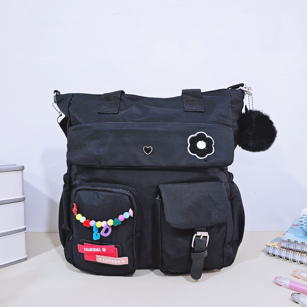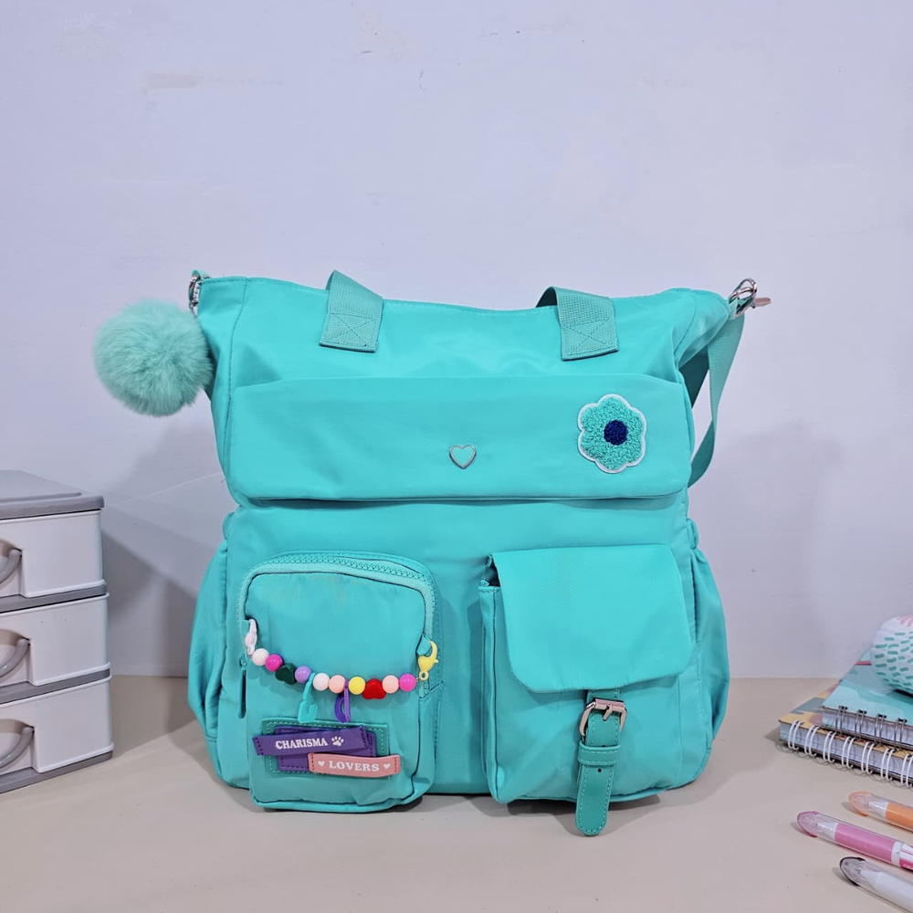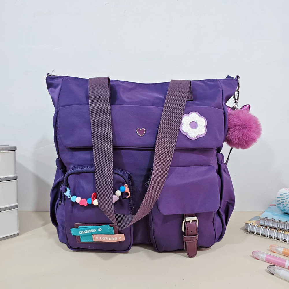 (Bolso grande disponible en 5 colores diferentes. Cuenta con un amplio compartimiento con dos bolsillos internos, un bolsillo frontal amplio + dos pequeños y dos bolsillos laterales, también incluye correa larga. Ideal para llevar cosas como maquillaje, celular o billetera).