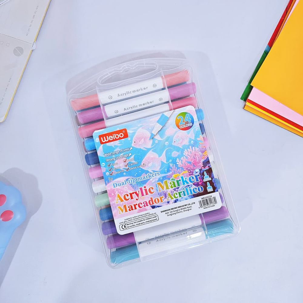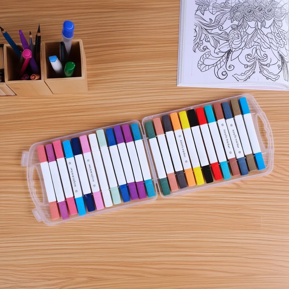 (Estos marcadores contienen pintura acrílica en su interior, lo que les permite pintar sobre casi cualquier superficie, como papel, madera, tela, vidrio y cerámica. tienen doble punta (una fina y una de pincel), lo que los hace versátiles para realizar detalles y rellenar áreas más grandes)