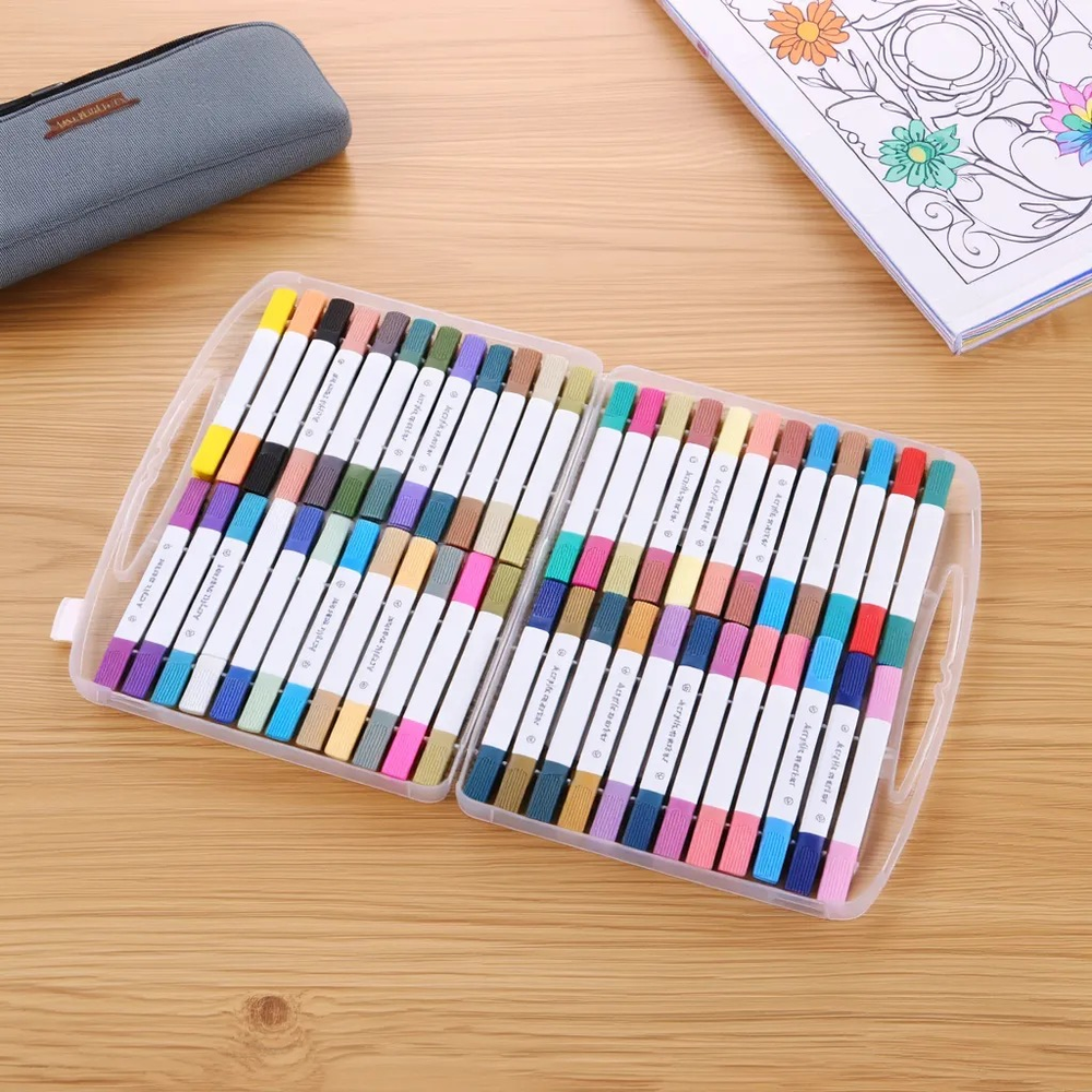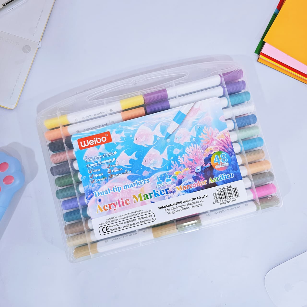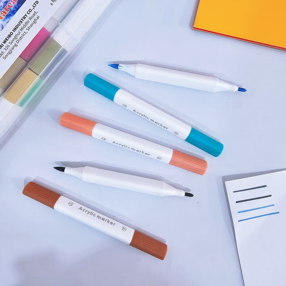 (Estos marcadores contienen pintura acrílica en su interior, lo que les permite pintar sobre casi cualquier superficie, como papel, madera, tela, vidrio y cerámica. tienen doble punta (una fina y una de pincel), lo que los hace versátiles para realizar detalles y rellenar áreas más grandes)