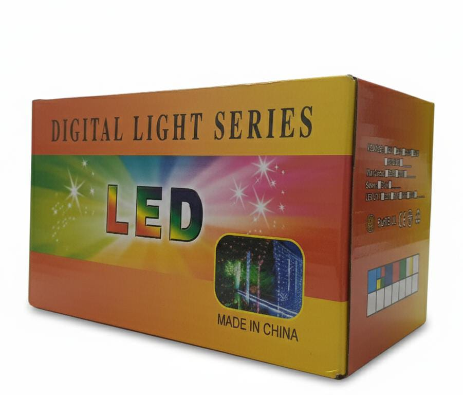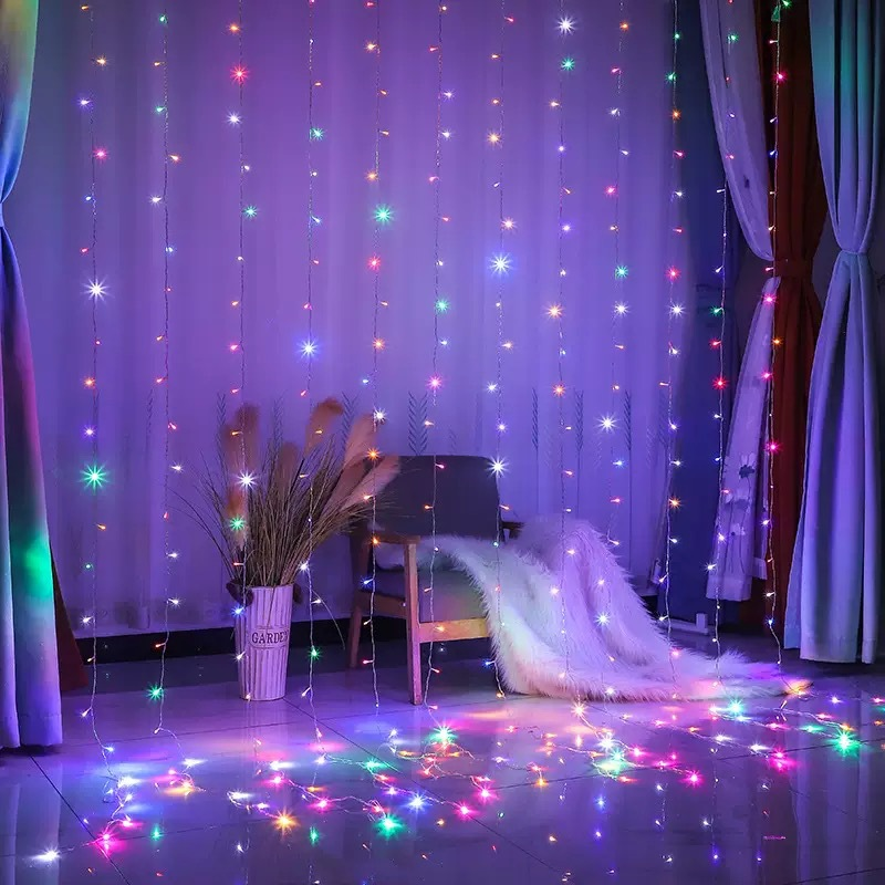 (Cortina de 275 luces LED Multicolor, ideales para decorar, tiene 3,76 metros de largo y 2,86mtrs de alto aproximadamente. Cuenta con 11 tiras cada una con 25 foquitos lo que genera un efecto visual similar a una cortina. Cuentan con diferentes modos de iluminación, como destellos o transiciones suaves, También incluye una extensión para conectar otras luces).