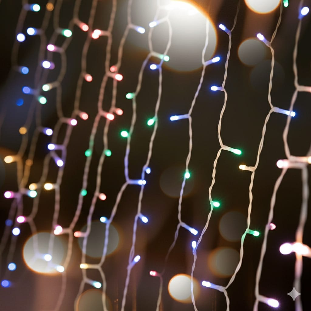 (Cortina de 192 luces LED Cálida, ideales para decorar, tiene 5,57 metros de largo lo que genera un efecto visual similar a una cortina. Cuentan con diferentes modos de iluminación, como destellos o transiciones suaves, También incluye una extensión para conectar otras luces ).