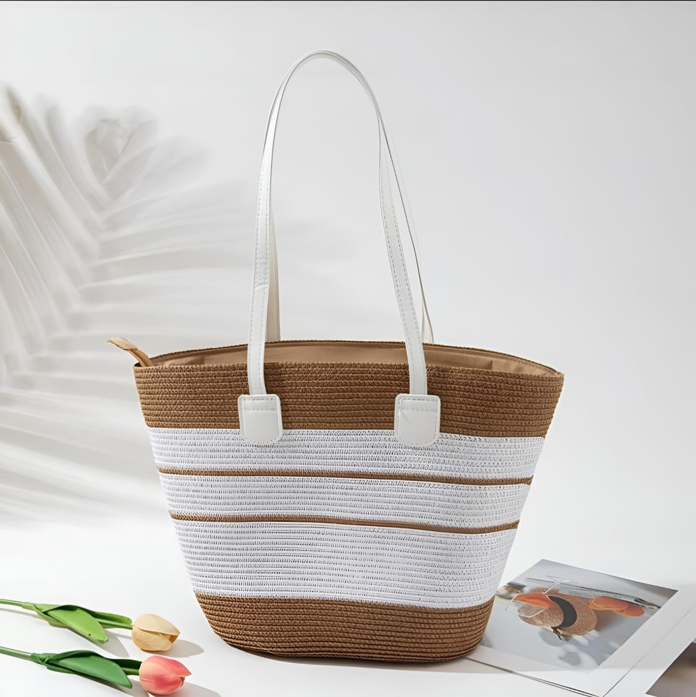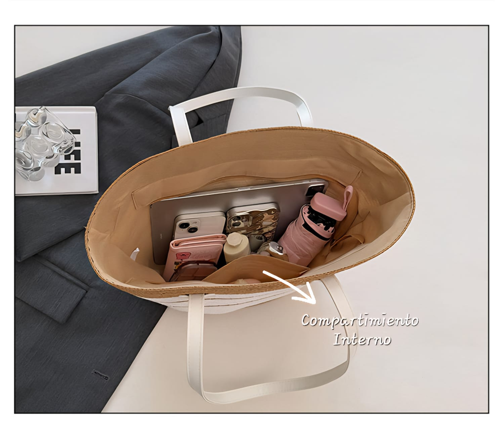 (Bolso playero diseñado para llevar fácilmente toallas, trajes de baño, protector solar, gafas, juguetes de playa y otros elementos esenciales a la playa o la piscina. Cuenta con 1 compartimiento interior. Aunque ideal para la playa, también puede usarse para compras o viajes, gracias a su ligereza, resistencia y facilidad de limpieza).