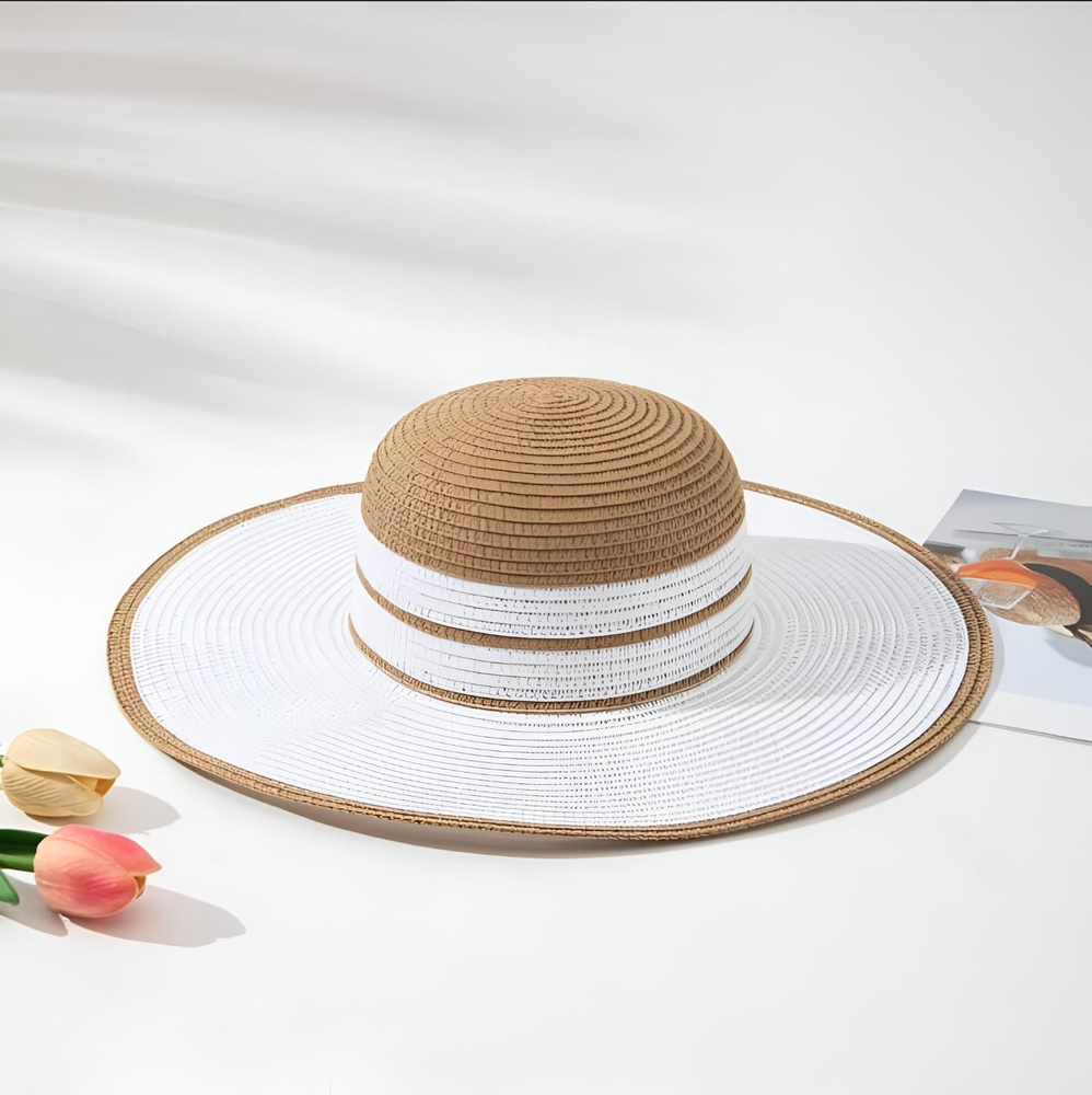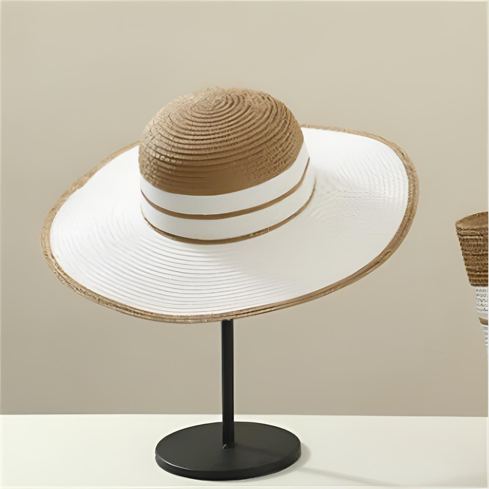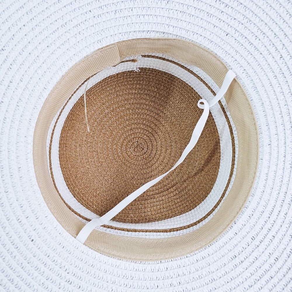 (Sombrero de dama que sirve para proteger la cara, el cuello y, en algunos casos, los hombros de los dañinos rayos solares, gracias a su ala ancha. Se utiliza como un complemento de estilo, especialmente en climas cálidos o durante actividades al aire libre como paseos, días de playa, jardinería o vacaciones. Este tipo de sombrero es ligeros y transpirable, lo que ayuda a mantener la cabeza fresca en ambientes calurosos. Diámetro de la cabeza: 19cm).