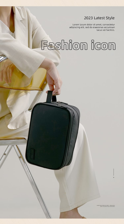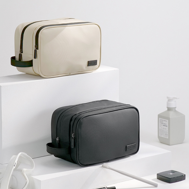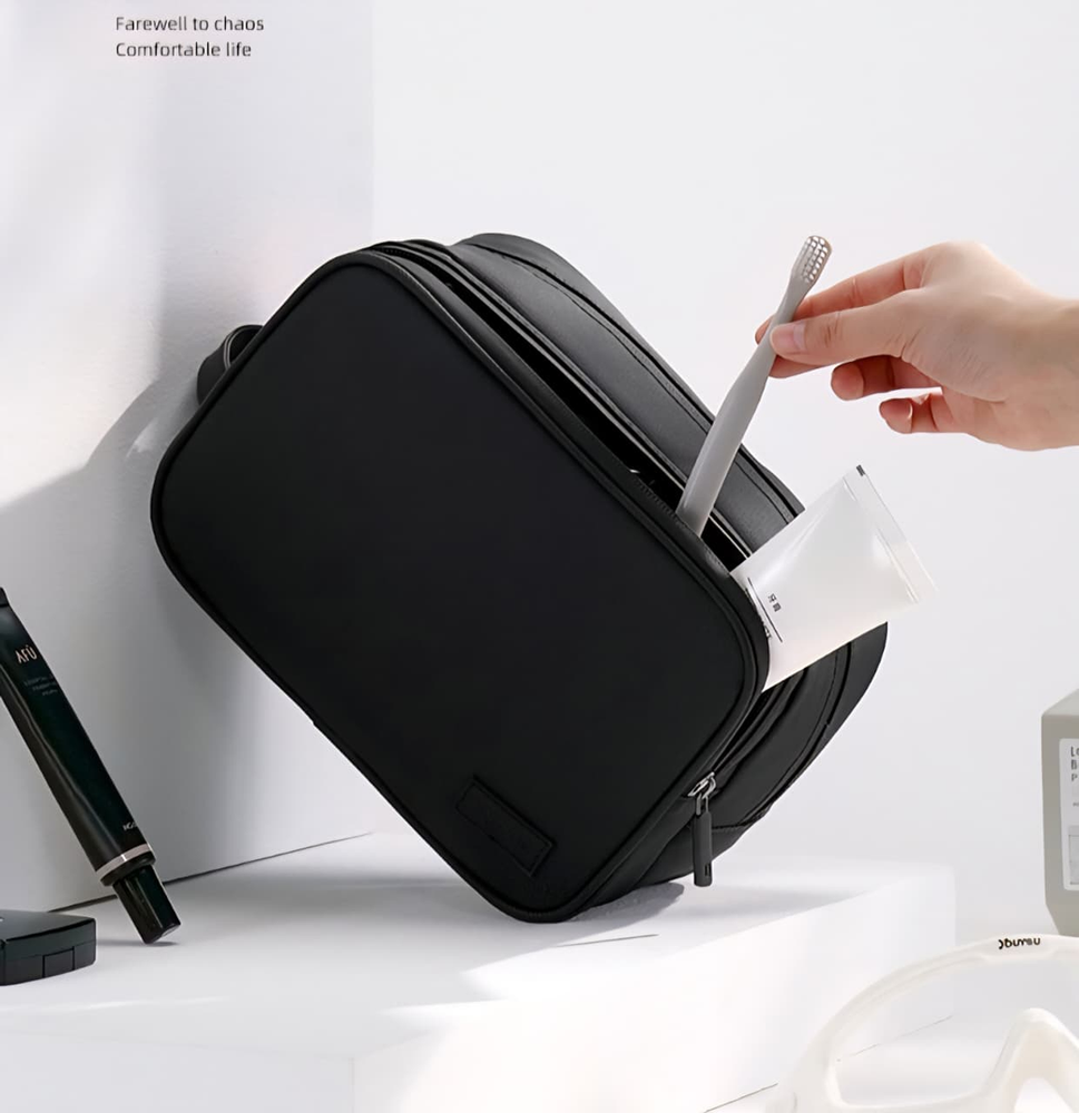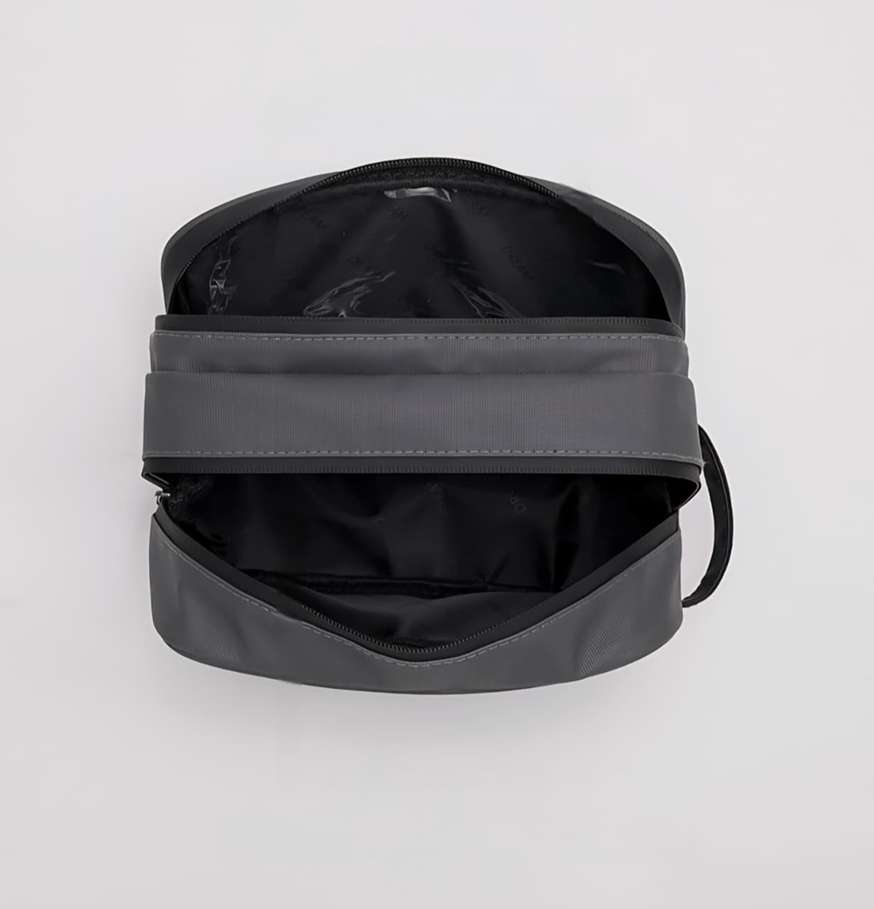 (Portacosmetico grande que sirve para organizar cualquier articulo en su interior. Ideal para utilizar en viajes. Cuenta con dos compartimientos grandes, uno de ellos impermeable y manija para poder transportarlo).