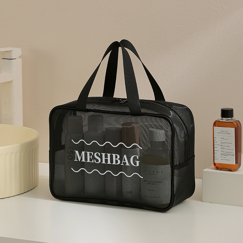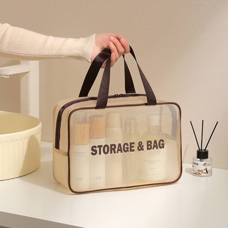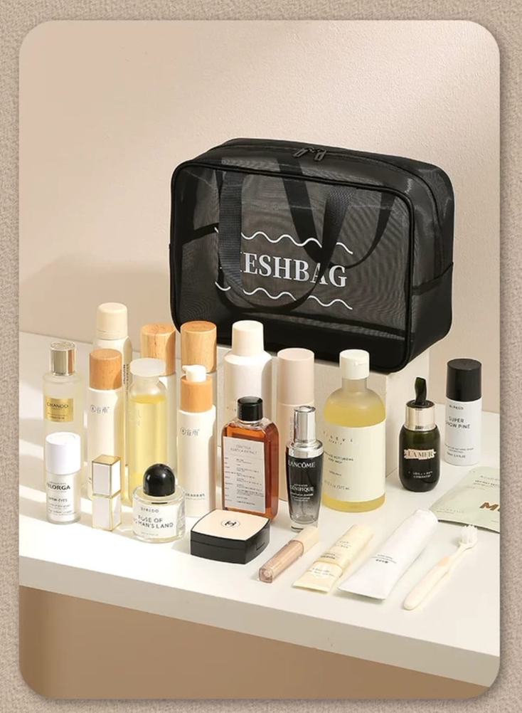 (Portacosmetico grande que sirve para organizar cualquier artículo en su interior. Ideal para utilizar en viajes. Cuenta con 1 compartimiento grande, es similar a un bolso y cuenta con manija para poder transportarlo. Disponible en color negro y marrón).