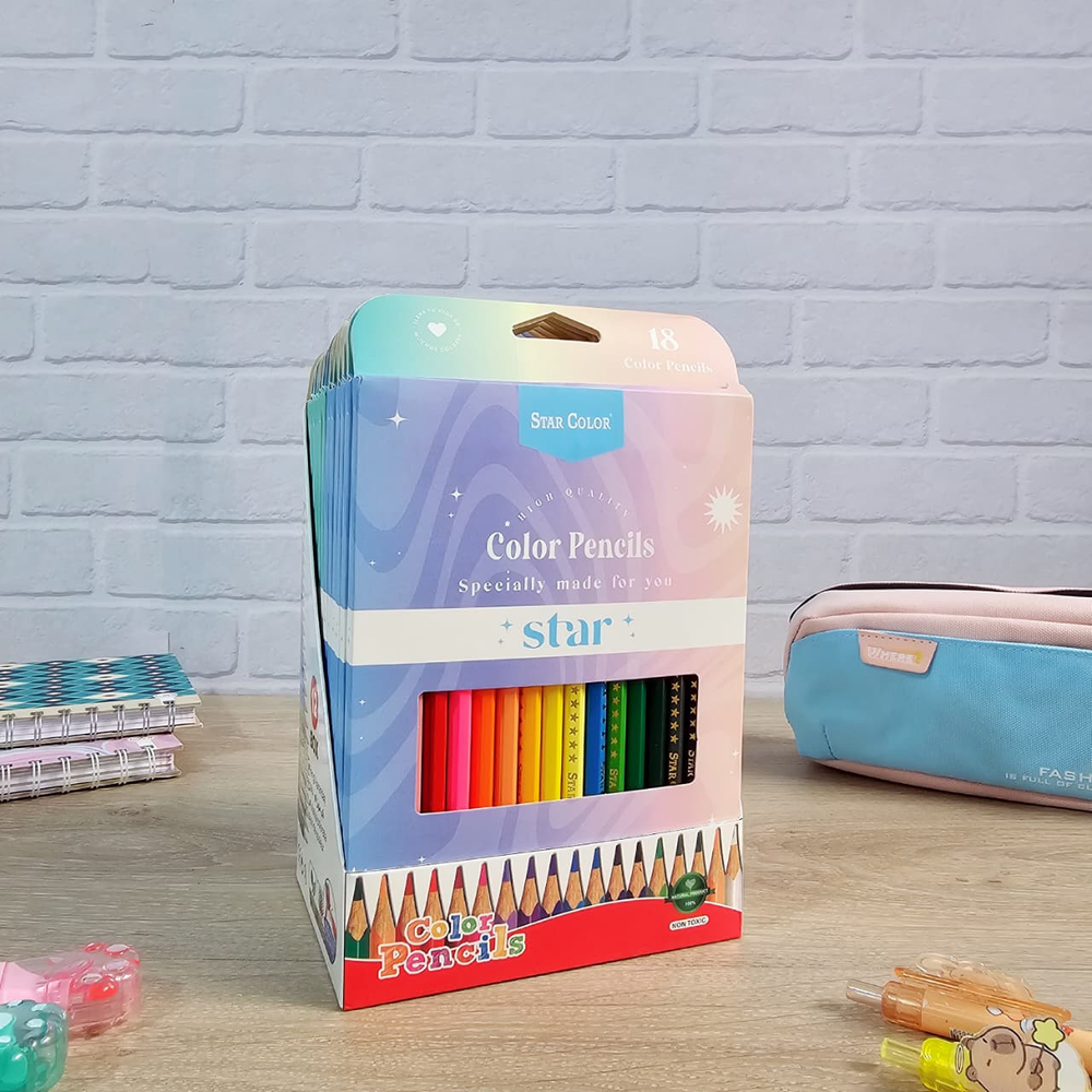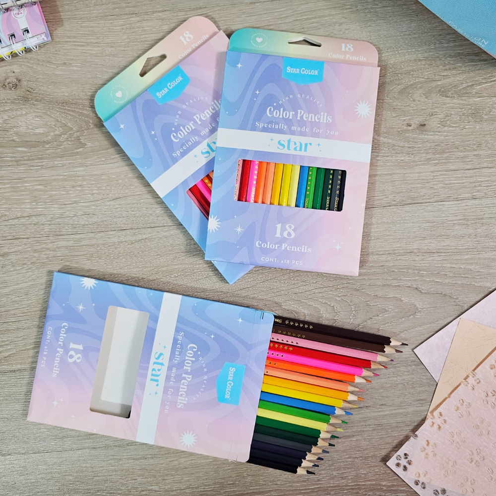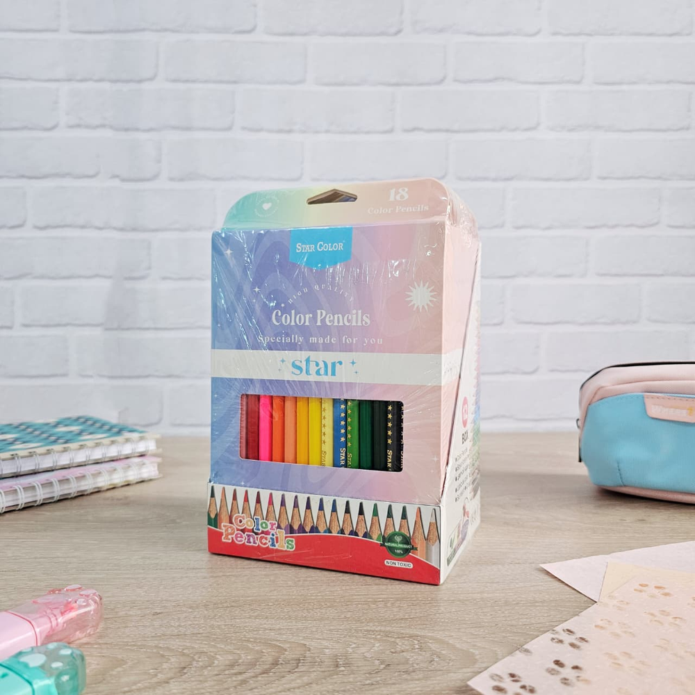 (Caja con 18 unidades de lápices colores surtidos,, mina resistente y además su forma triangular permite un fácil agarre para escribir o pintar)