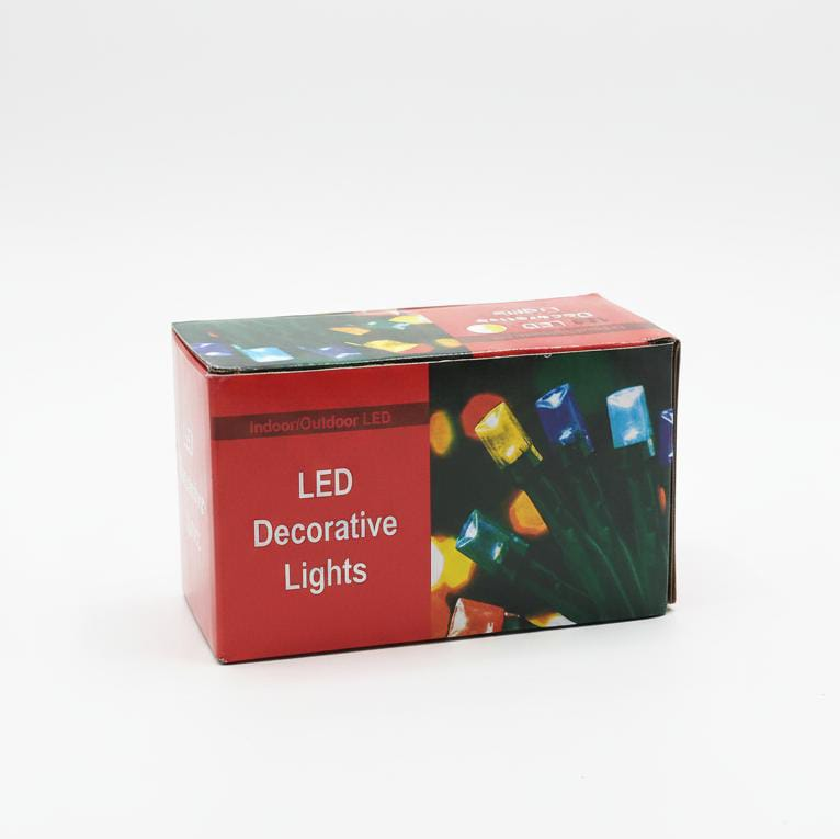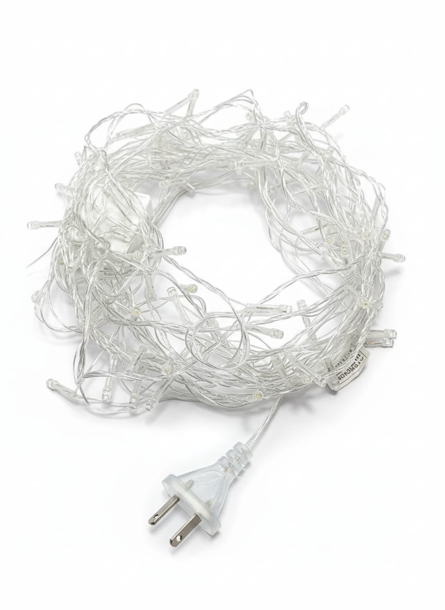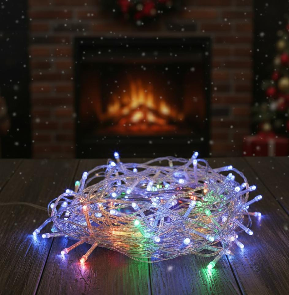 (Tira de 100 luces LED Multicolor, ideales para decorar, funciona enchufada, cuenta con alargue y botón para cambiar la intensidad de las luces.)