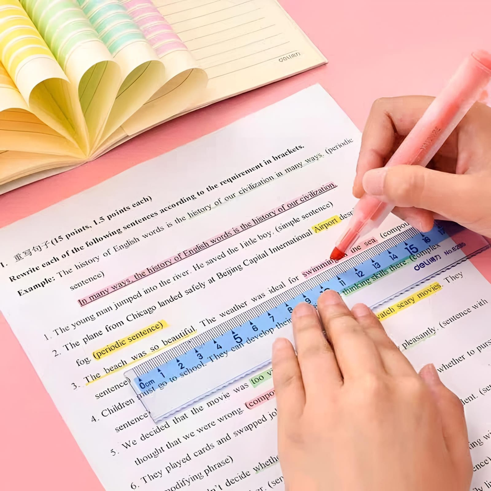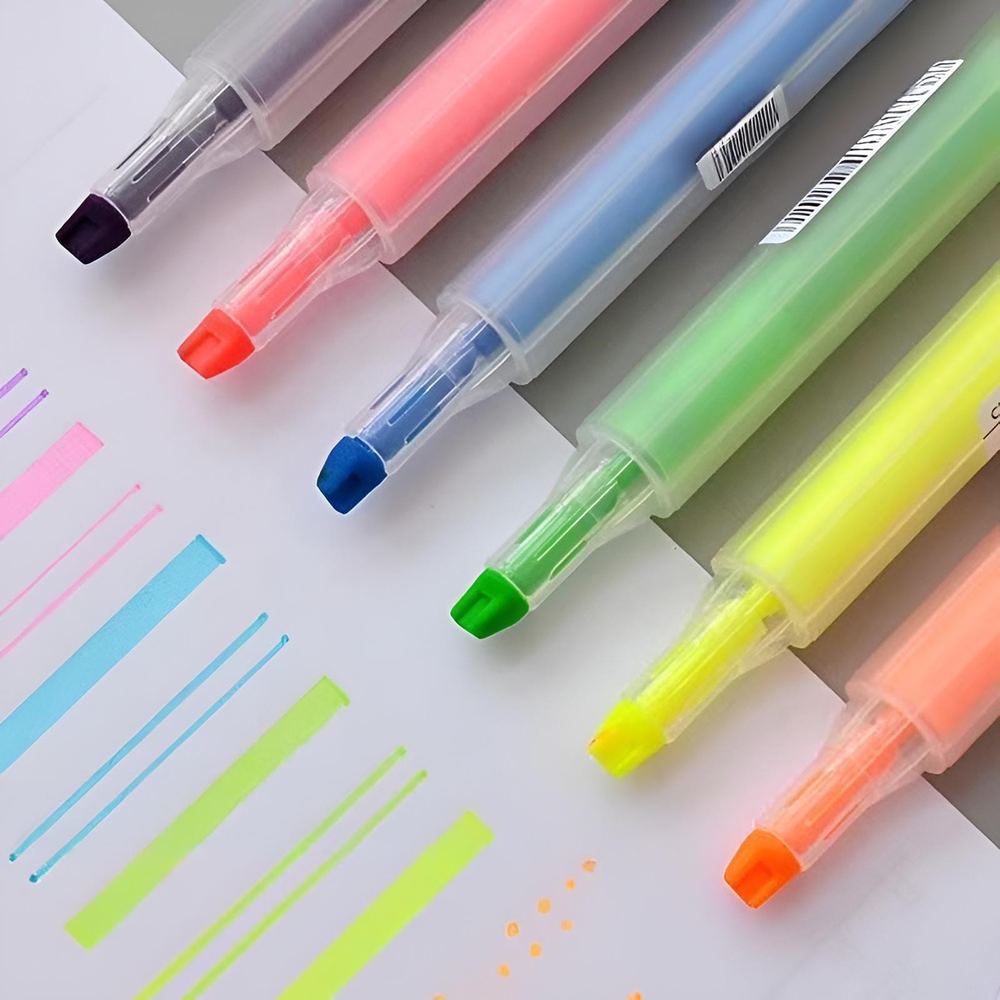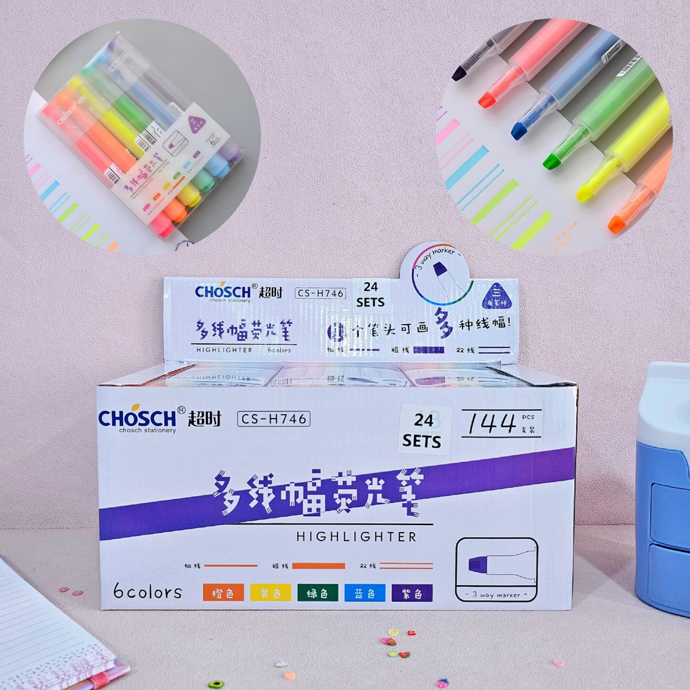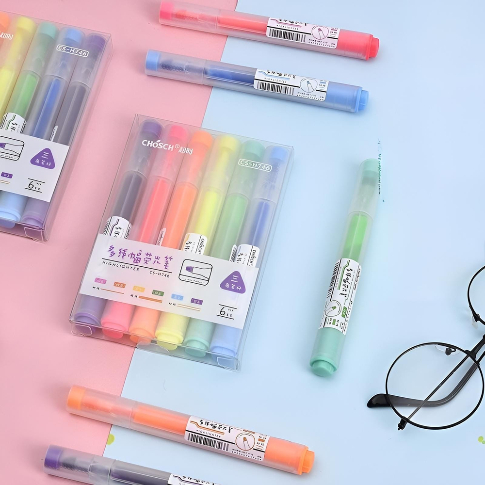 (Set de 6 resaltadores de gel sólidos CHOSCH modelo CS-H746. Se utilizan para resaltar texto en libros, cuadernos y documentos, lo que facilita la identificación de información importante para el estudio y la organización. Son adecuados para diversas aplicaciones, como la decoración de diarios, calendarios y cuadernos. Cuentan con dos trazos dentro de la misma punta para ofrecer precisión y versatilidad al resaltar y subrayar).