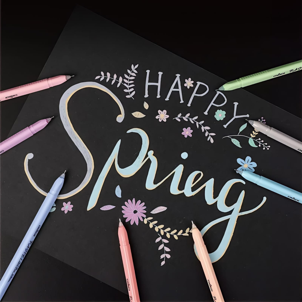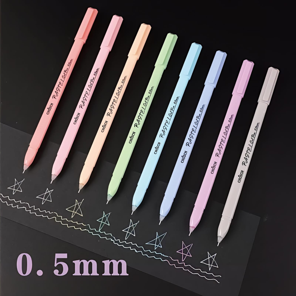 (Set de 8 Biromes en gel de la marca Chosch, modelo Macaron Pastel (CS-G236). Tienen tinta de colores pastel. Cada una de las biromes tiene punta de 0.5 mm. Están diseñados para escribir y dibujar sobre papel blanco y negro).