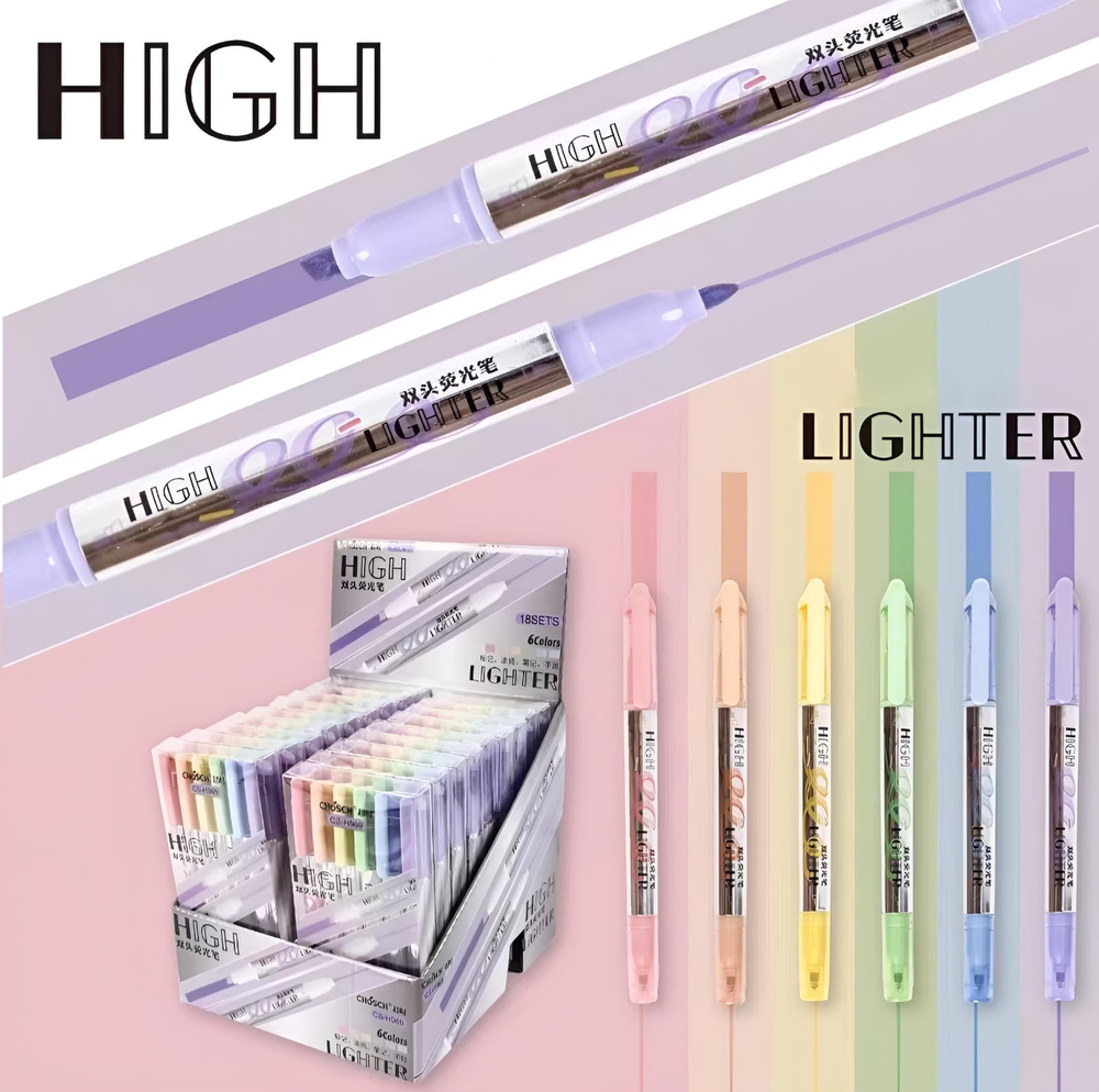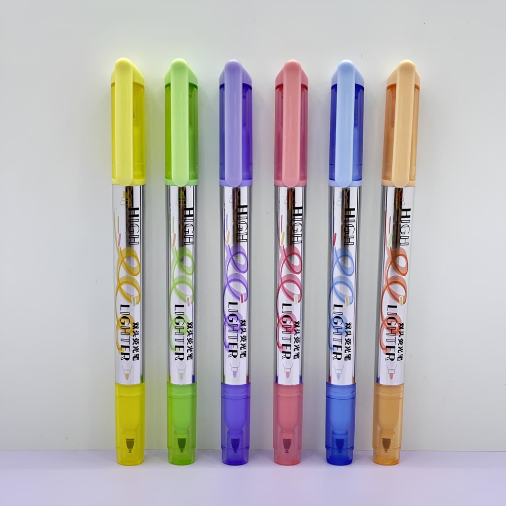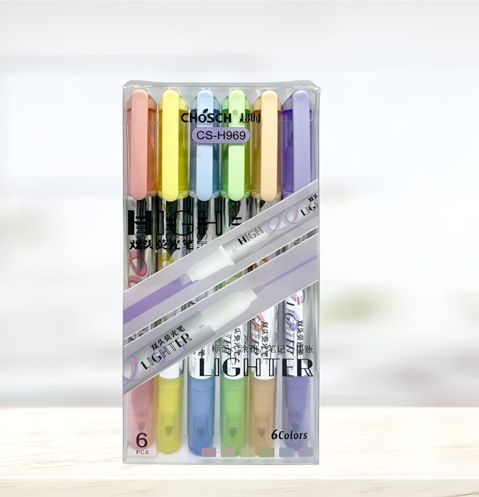 (Set de 6 resaltadores CHOSCH. Estos marcadores tienen dos puntas diferentes, lo que los hace versátiles para diversas tareas Una de sus puntas se utiliza para resaltar texto de manera uniforme y rápida en notas, libros o documentos. Y la otra sirve para subrayar, delinear o añadir detalles más precisos).