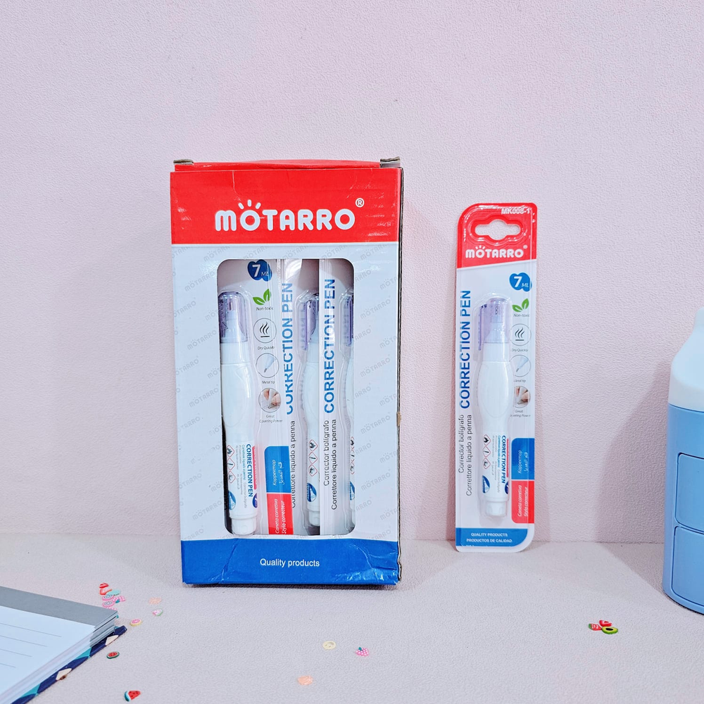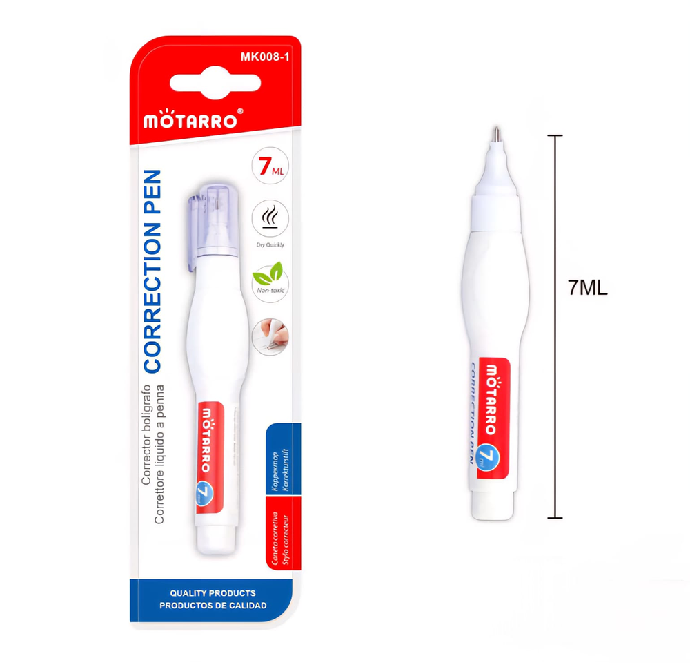 (Corrector Liquido Motarro MK008-1. Es un lápiz corrector de secado rápido con un cuerpo de plástico flexible que contiene 7 ml. El líquido es opaco, blanco y de secado rápido, diseñado para cubrir errores de escritura en papel. Al presionar el cuerpo, se incrementa el flujo del líquido, lo que permite un control superior durante la aplicación).
