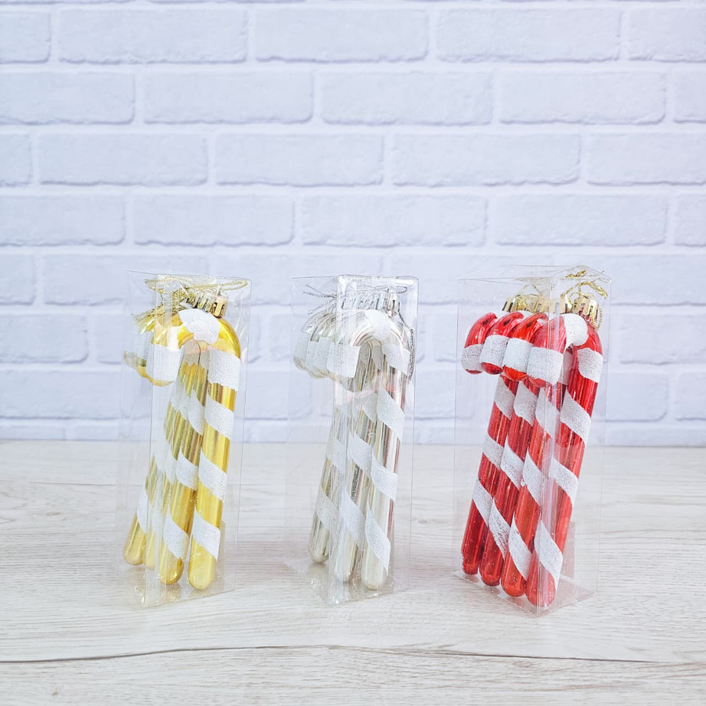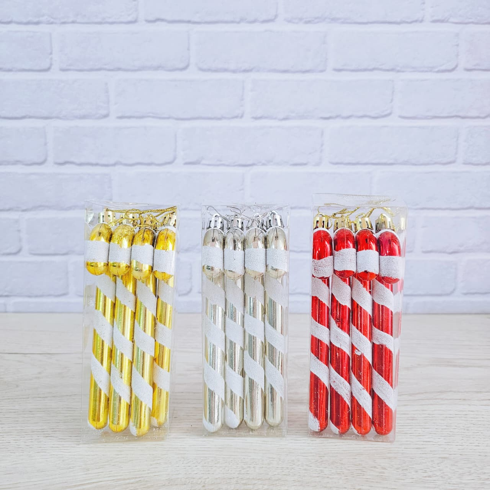 (Set x 4U. Adornos navideños en bastones navideños en rojo, plateado y dorado . Ideal para decorar tu arbolito)