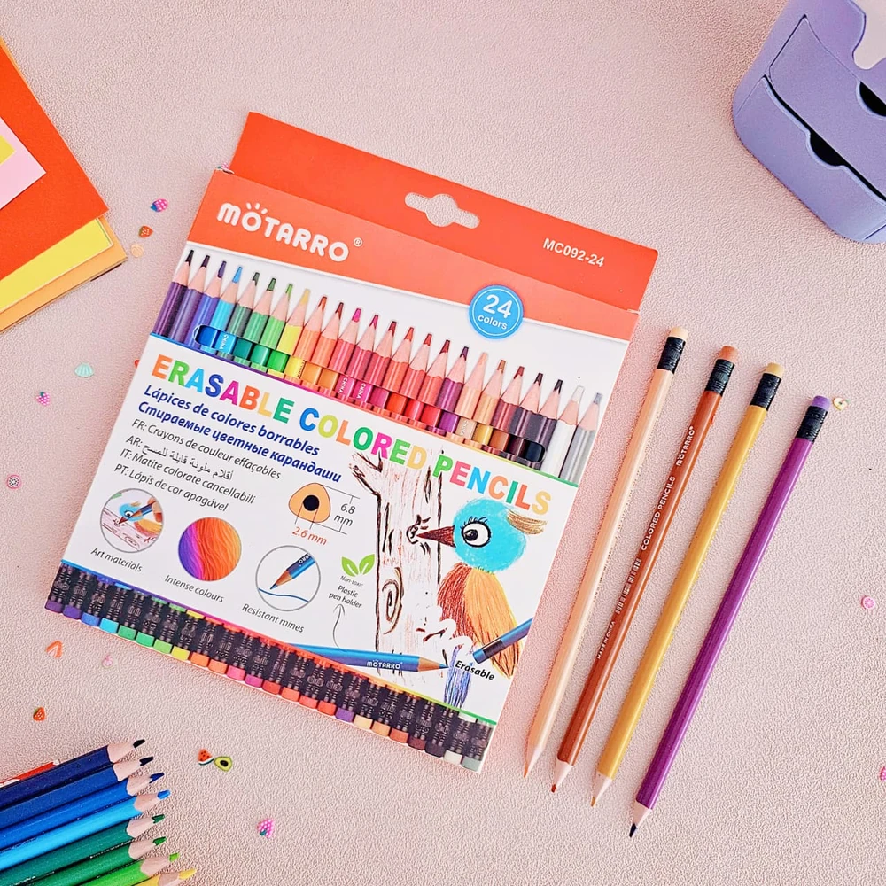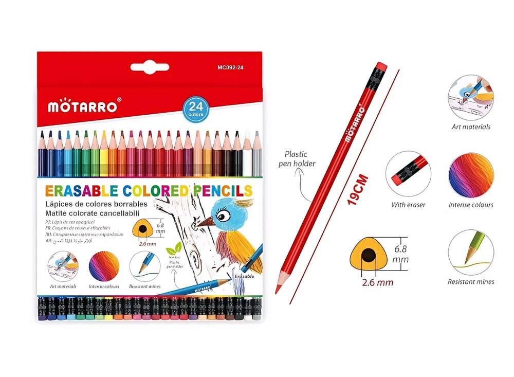 (Set 24 unidades de lápices de colores intensos, cada uno tiene una goma en la parte superior para borrar lo que dibujes o colorees. Mina resistente de 2.6mm.). (Js31)