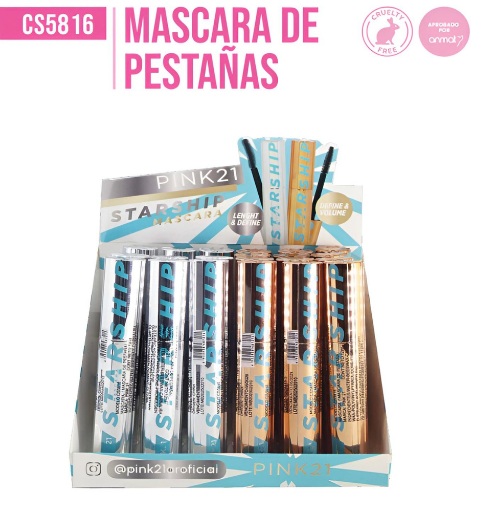 (Caja x 24U. Mascara de Pestañas Starship de Pink 21, un producto de maquillaje diseñado para definir, dar volumen y alargar las pestañas. Cepillo Dorado: Proporciona definición y volumen a las pestañas. Cepillo Plateado: Se utiliza para alargar y definir las pestañas. La fórmula está diseñada para lograr pestañas con volumen, definición y alargamiento en una sola aplicación, evitando grumos).