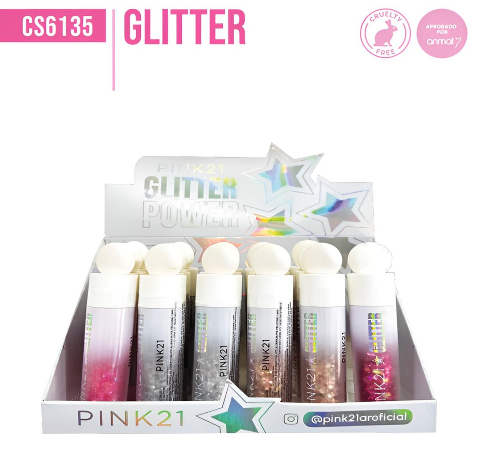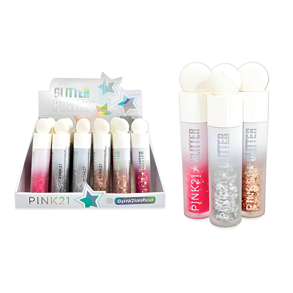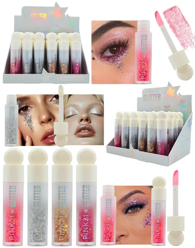 (Caja x24u de glitter con mucho brillo, larga durabilidad y un aplicador grande para facilitar su uso. Las sombras con glitter de Pink 21 son ideales para crear looks llamativos y tienen una pigmentación intensa).