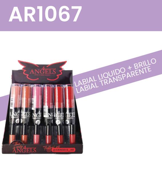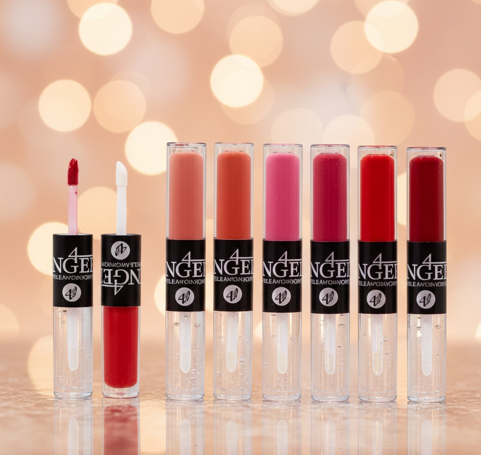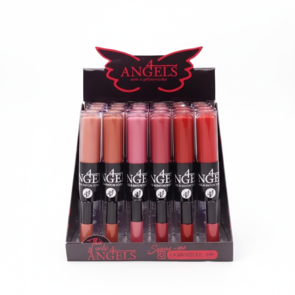(Caja x24U. Labial liquido y brillo "4 Angels". Labiales líquidos con efecto matte. Su brillo labial ofrece hidratación y protección para los labios. Tiene una textura líquida y no pegajosa. Esta disponibles en 6 tonos).