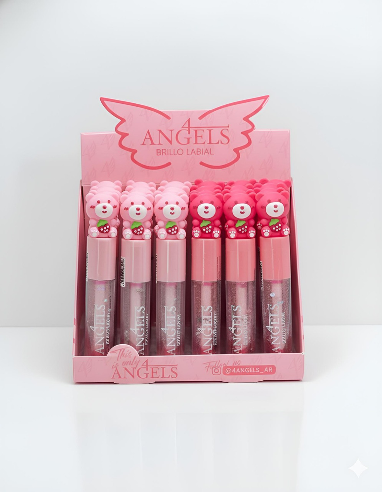 (Caja x24U. Brillo Labial "4 Angels". Este brillito cuenta con 2 opciones diferentes. Cada uno con un rico aroma frutal. Ideal para que tus labios brillen al natural).