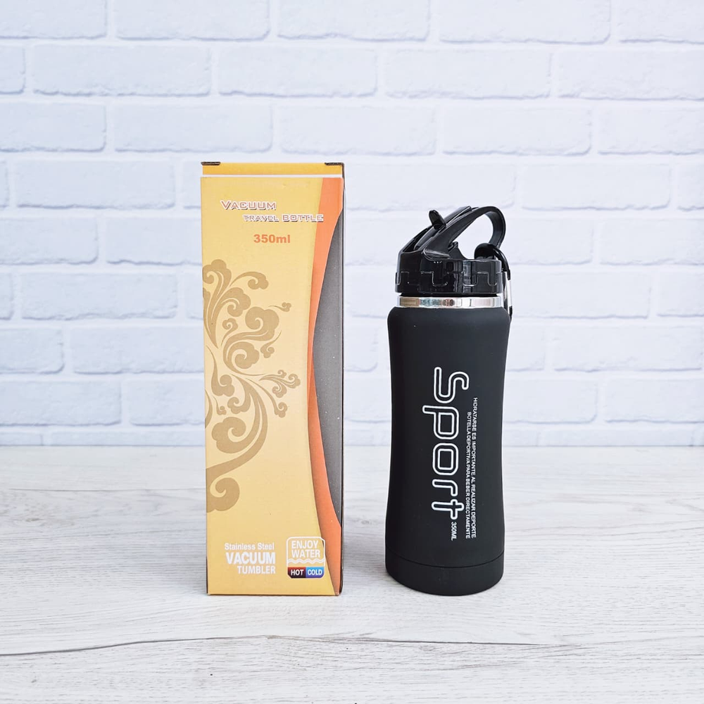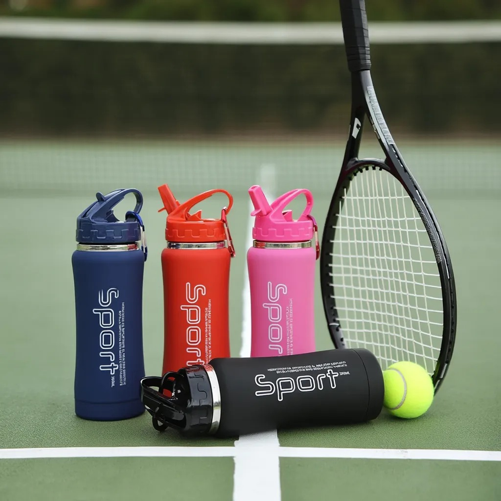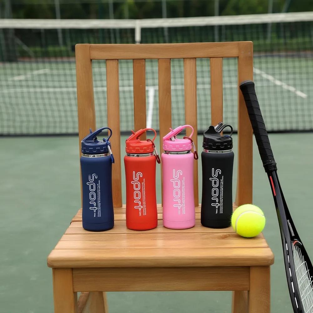 (Botella con pico rebatible y sorbete. Están fabricadas en acero inoxidable de doble capa, el exterior de la botella tiene una pintura engomada antideslizante para un mejor agarre. Cuentan con un tapón hermético que evita derrames y un gancho para colgarlas en una mochila, lo que las hace muy prácticas para llevar al gimnasio, al colegio o a cualquier otra actividad).