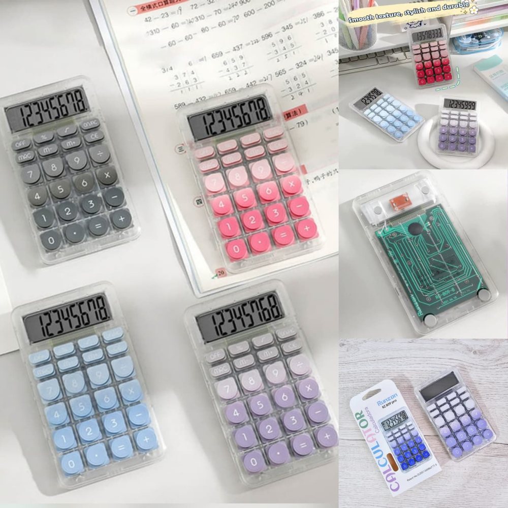 (Calculadoras transparente con botones en colores degradé de 8 dígitos, tiene un diseño delgado y ligero lo que la hace ideal para uso escolar o de oficina. Funciona con energía solar,cuenta con una pila de respaldo para funcionar en condiciones de poca luz).