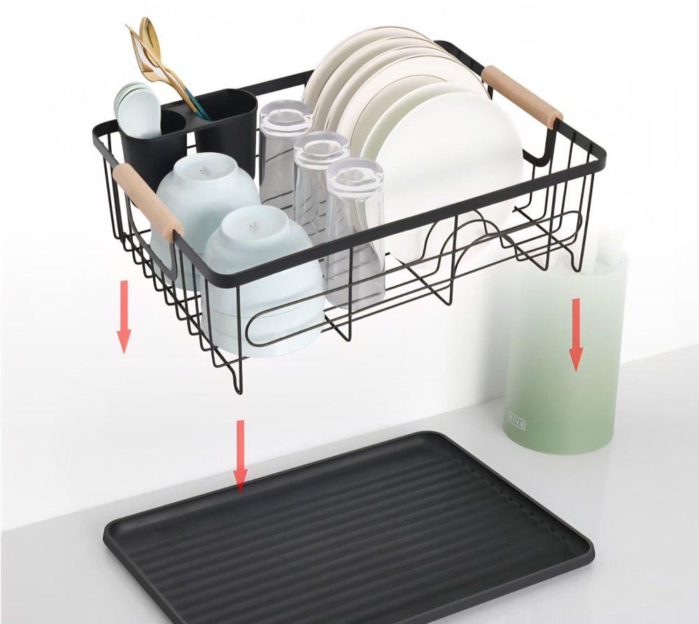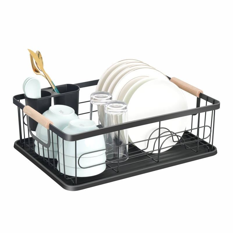 (Escurreplatos metálico con bandeja de goteo, diseñado para secar platos, vasos y cubiertos. Es de metal y tiene asas de madera. Incluye un soporte para cubiertos y una bandeja inferior para recoger el agua, manteniéndola seca).