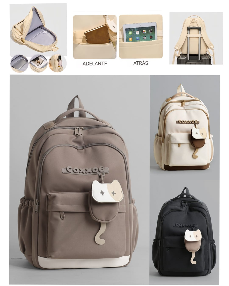 (Mochila escolar o casual. Dispone de un compartimiento principal con 1 bolsillos interno, 2 compartimientos frontales, 2 bolsillos laterales, un monedero y un bolsillo trasero).
