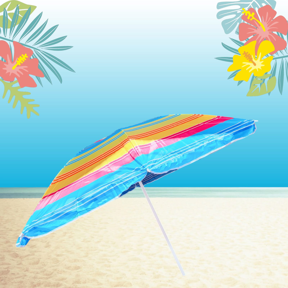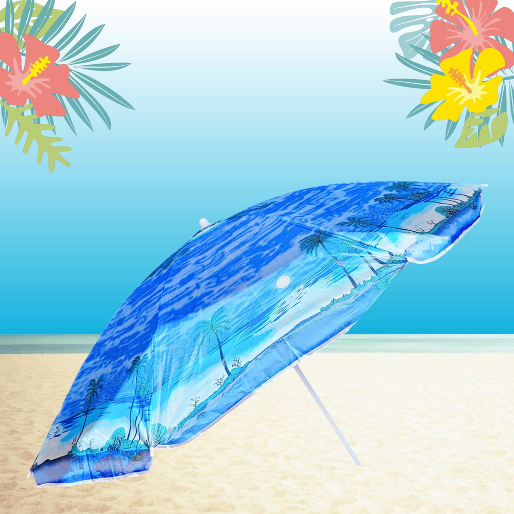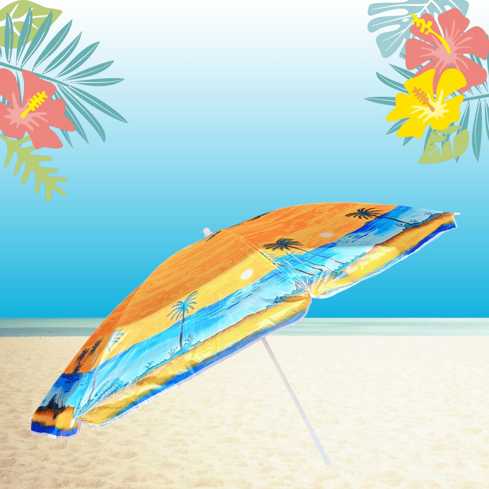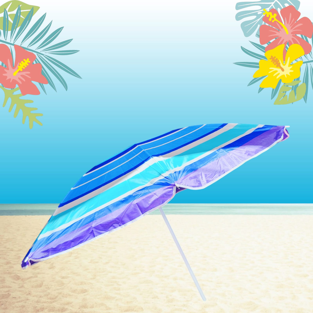 (Sombrilla de poliéster estampado, tiene ancla de arena integrada,8 varillas y su altura es regulable. Diámetro del caño 2.5/1.7 cm).