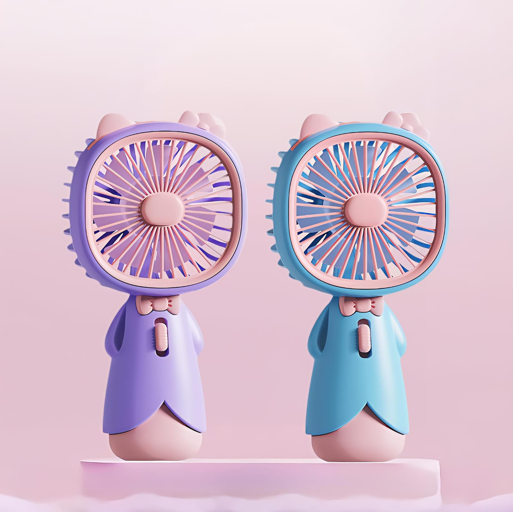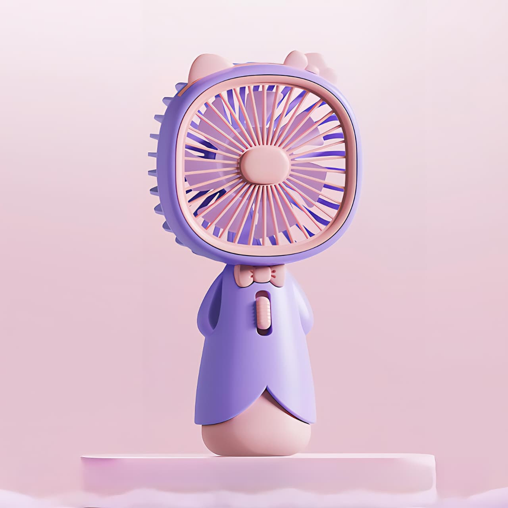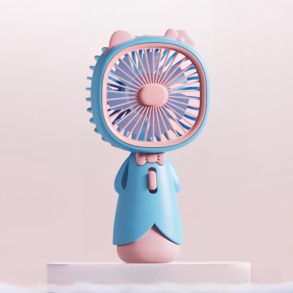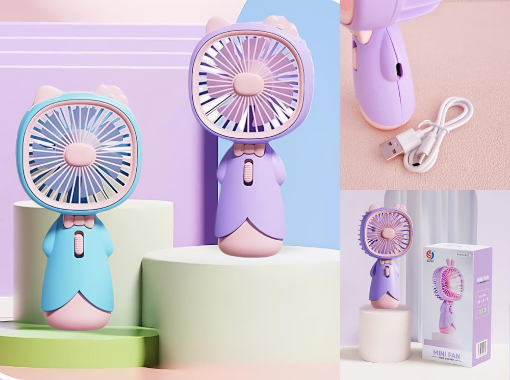 (Ventilador portátil que dispone de cargador USB para carga. Boton de encendido/ apagado en la parte delantera)