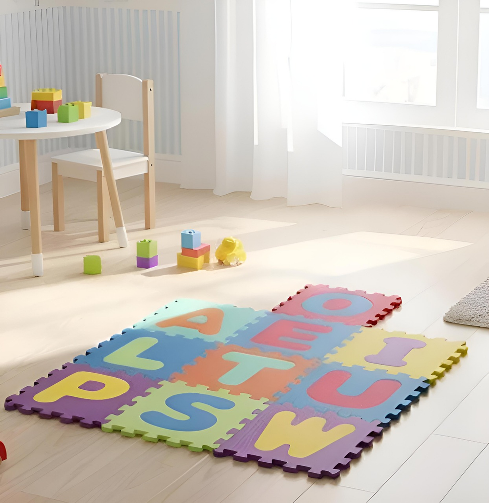 (Piso encastrable infantil de goma eva con letras en colores surtidos. Proporciona una superficie acolchada y segura para que los bebés y niños pequeños gateen, jueguen y aprendan, protegiéndolos de posibles caídas y golpes gracias a su grosor y material antigolpes. El diseño colorido estimula la imaginación, el desarrollo visual y el aprendizaje temprano de conceptos. Es ideal para usar en habitaciones infantiles, salas de juegos, guarderías o cualquier espacio donde se desee crear un rincón de juego seguro. Fabricada con goma eva de alta calidad, es resistente, duradera y fácil de limpiar).