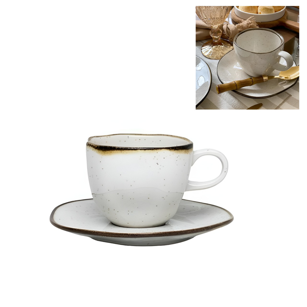 (Las tazas de café, están fabricadas en porcelana. Son conocidas por su calidad, resistencia y funcionalidad, siendo aptos para lavavajillas y microondas. Son ideales para servir espresso o café corto, y se vienen junto con el plato).