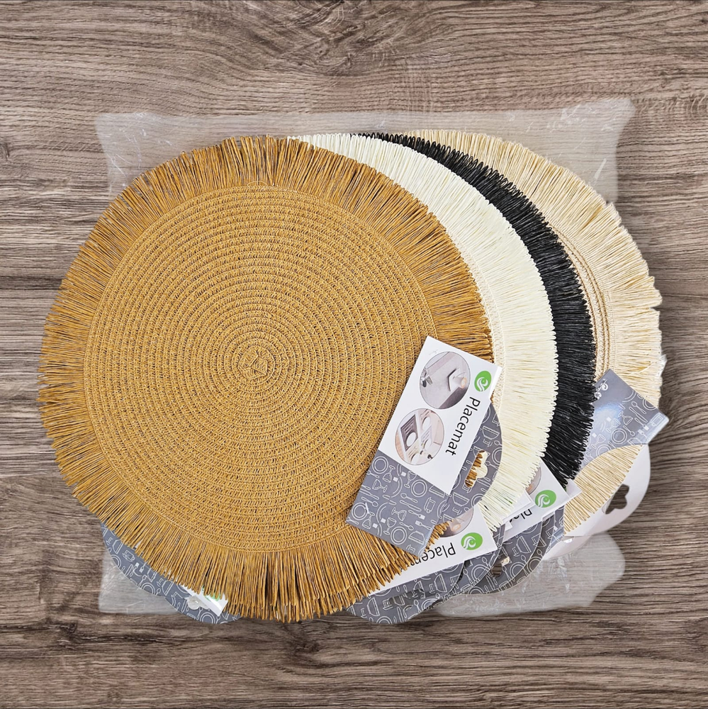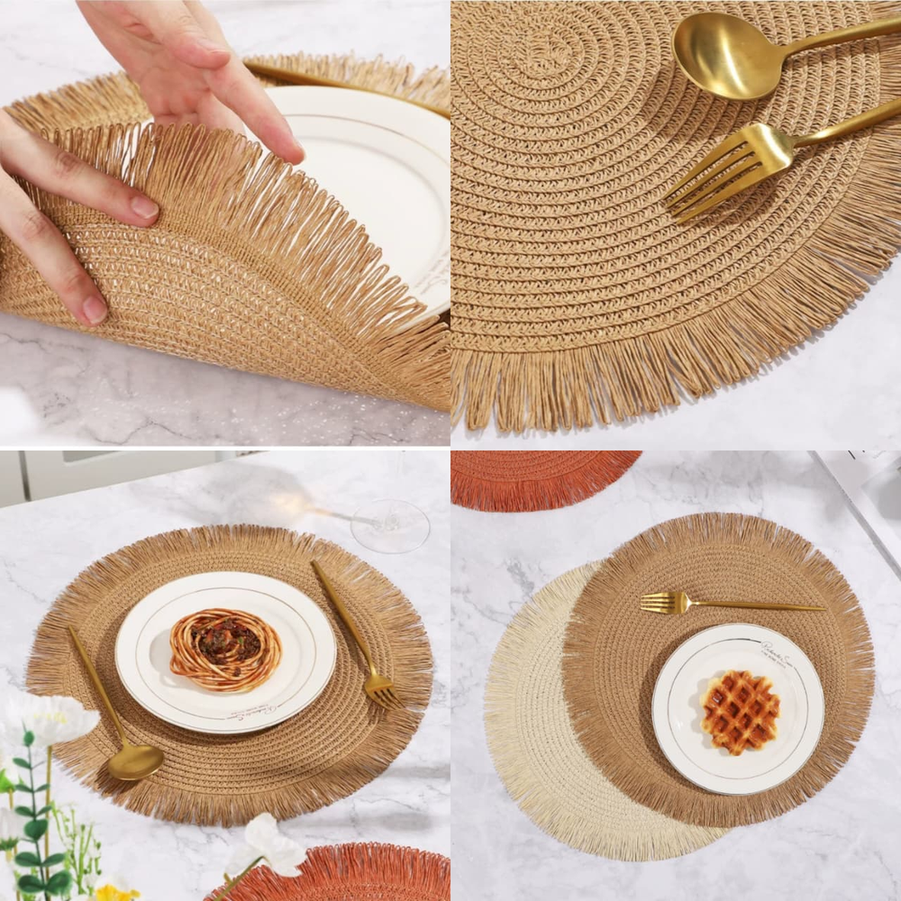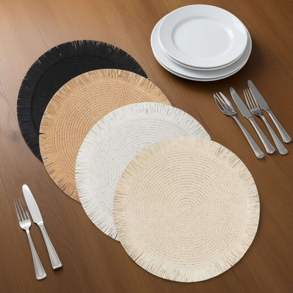 (Individuales de mesa en tonos de color marrón, beige y negro, hechas con fibras naturales. Ideales para el día a día o incluso hasta para una cena elegante).