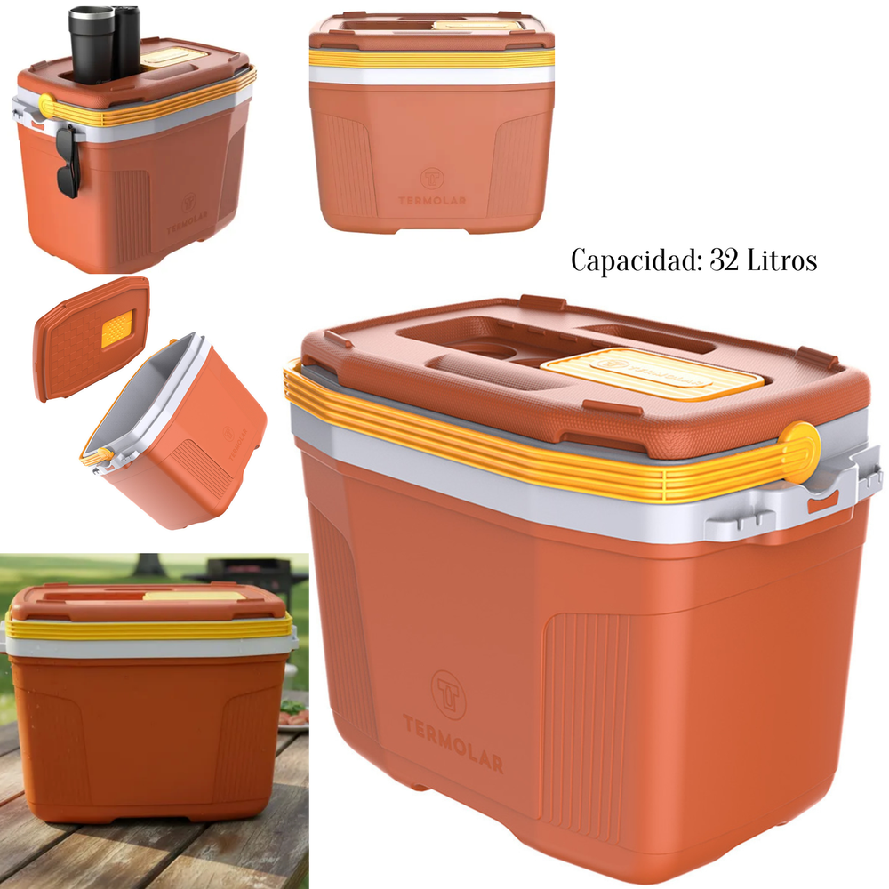 (Conservadora con capacidad de 32 litros.Tiene apertura deslizante con estuche para guardar las pertenencias. Conservación térmica diferenciada a través del Sistema Air Flow, permite la circulación de aire por la base. Conserva 24 horas las bebidas y 12 horas los alimentos (con el uso de hielo 20%). Mango Reforzado y resistente proporcionando seguridad para el transporte individual. Mayor ergonomía a través de angulaciones en las esquinas. Tiene su tapa con asas superiores e inferiores que posibilitan la apertura con una sola mano, además de ser reversible). • Dimensiones de la conservadora:
