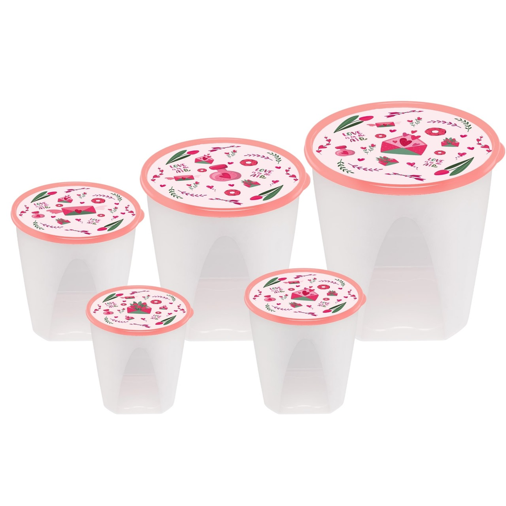 (Set de cinco Tuppers de plástico redondos para almacenar alimentos, con tapas decoradas. Los recipientes son transparentes, permitiendo ver el contenido. Son ideales para organizar la despensa, llevar almuerzos o guardar sobras).