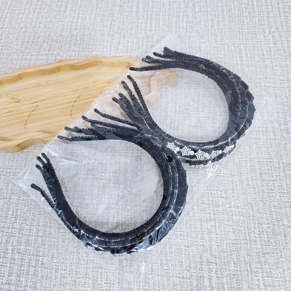 (Paquete con 12 unidades de vinchas forradas con tela aterciopelada negra, cuenta con un adorno de strass el cual tiene forma del diseño como se presenta en la foto)