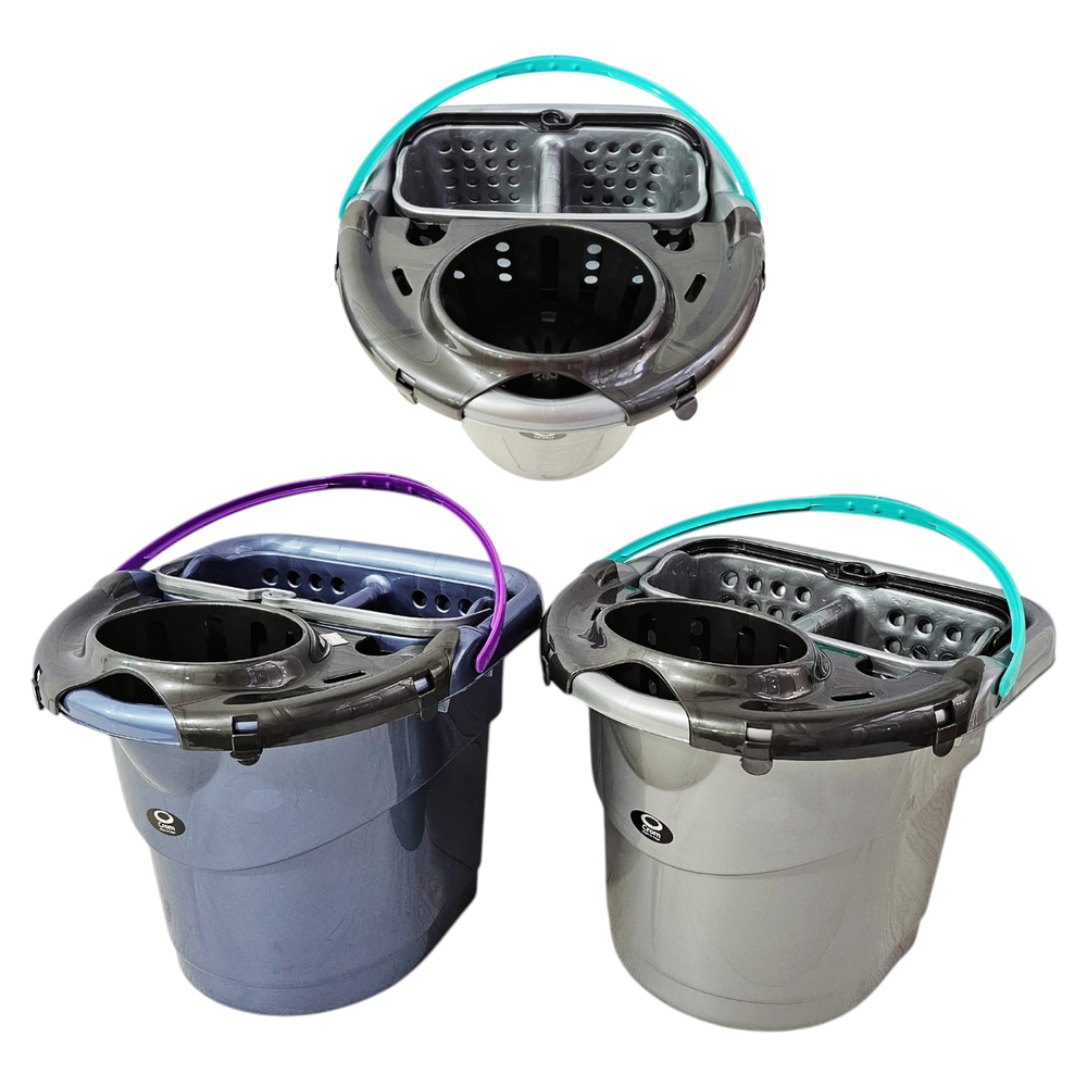(Balde centrífugo para mopa giratoria. Este sistema de limpieza está diseñado para escurrir la mopa sin esfuerzo y sin contacto manual con el agua sucia. El balde cuenta con un sistema de centrifugado activado por presión, cuenta con 1 canasto con divisiones para trasladar artículos de limpieza).